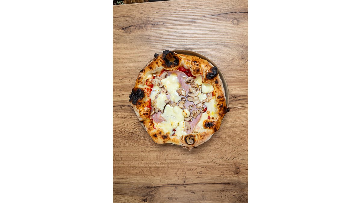 testo, paradajz pelat, mocarela, šunka, šampinjoni, origano, kisela pavlaka