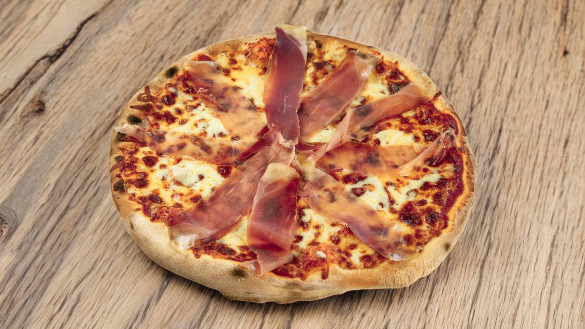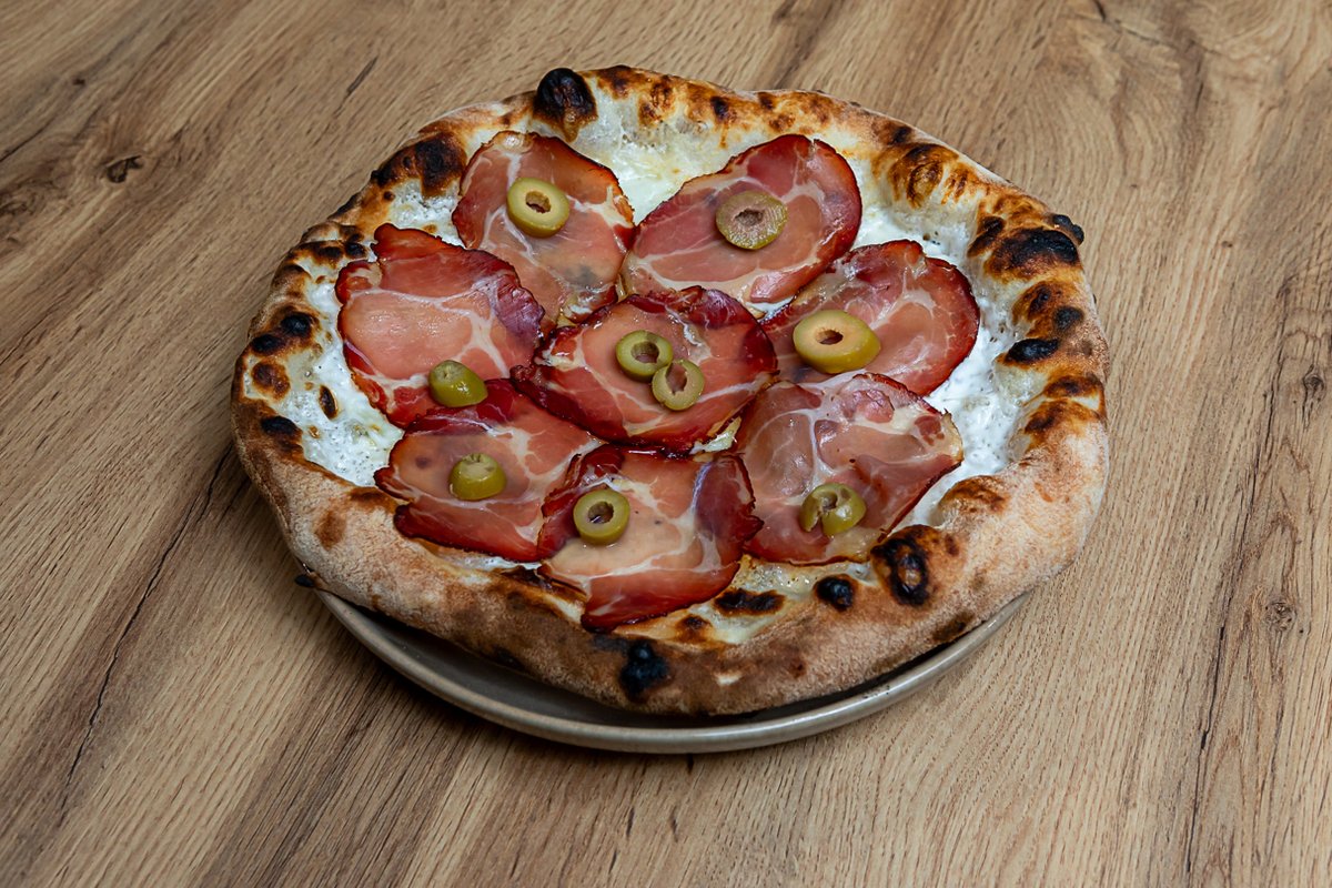 testo, krema od parmezana, mocarela, gorgonzola, dimljeni svinjski vrat, masline