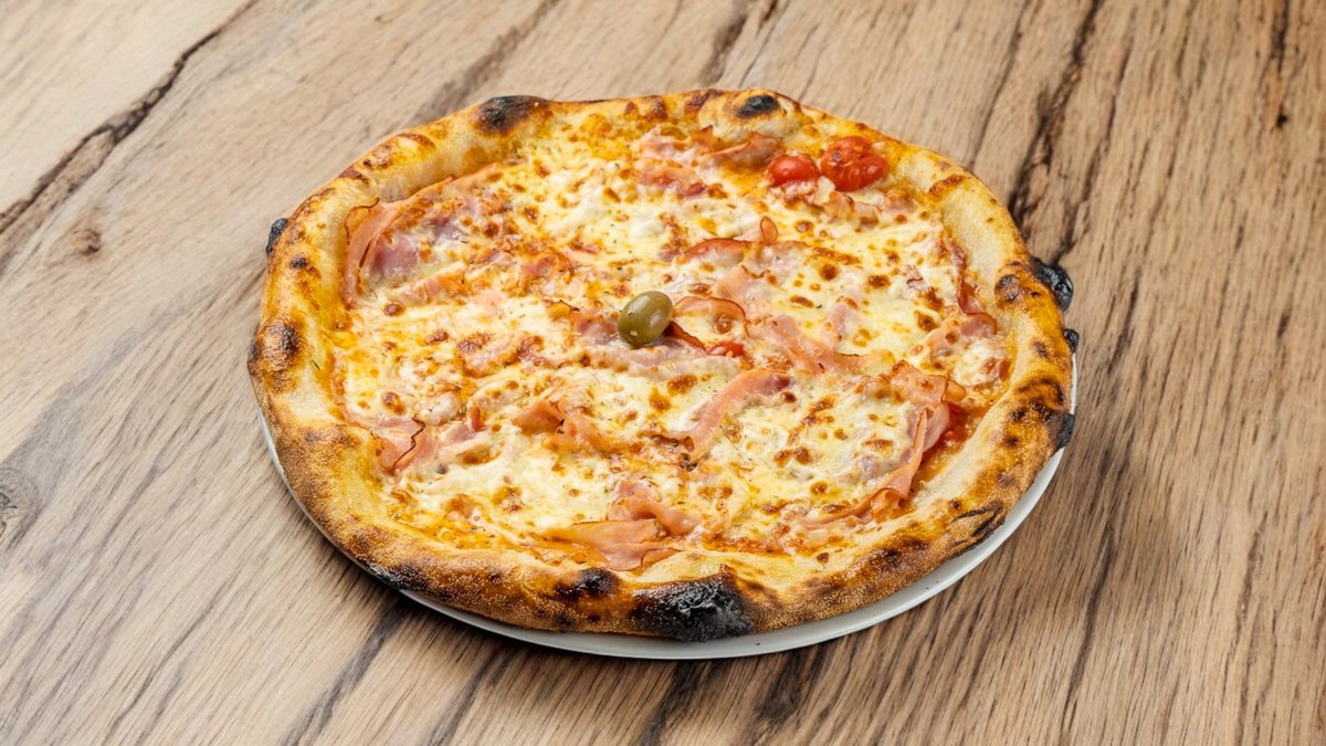 testo, paradajz pelat, mocarela, šunka, šampinjoni, masline, origano