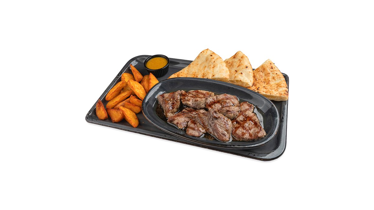 Juneće meso 250g, sos od maslinovog ulja, senf-med sos, domaćinski krompir 100g, somun