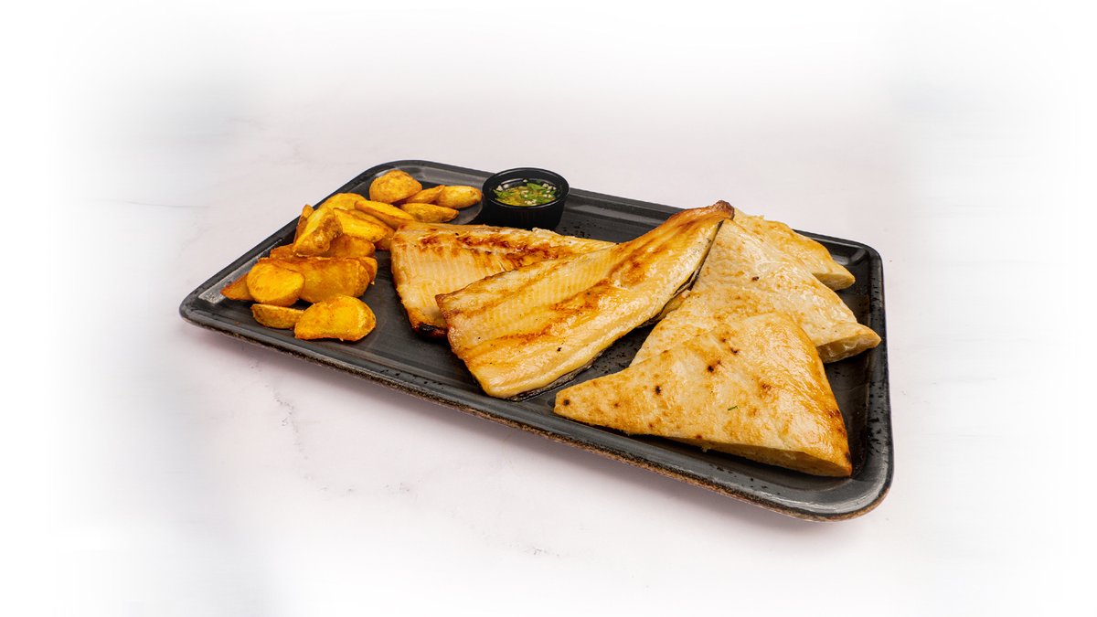 Stek od lososa 200g, domaćinski krompir 100g, senf-med sos, marinada od belog luka, somun