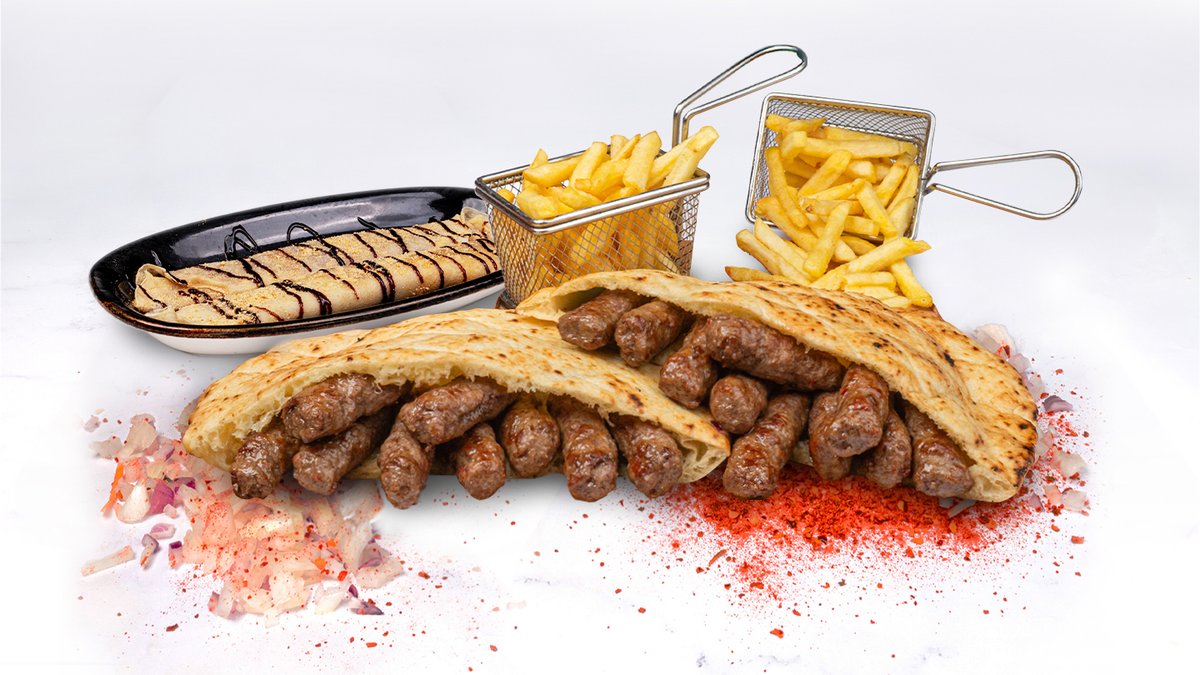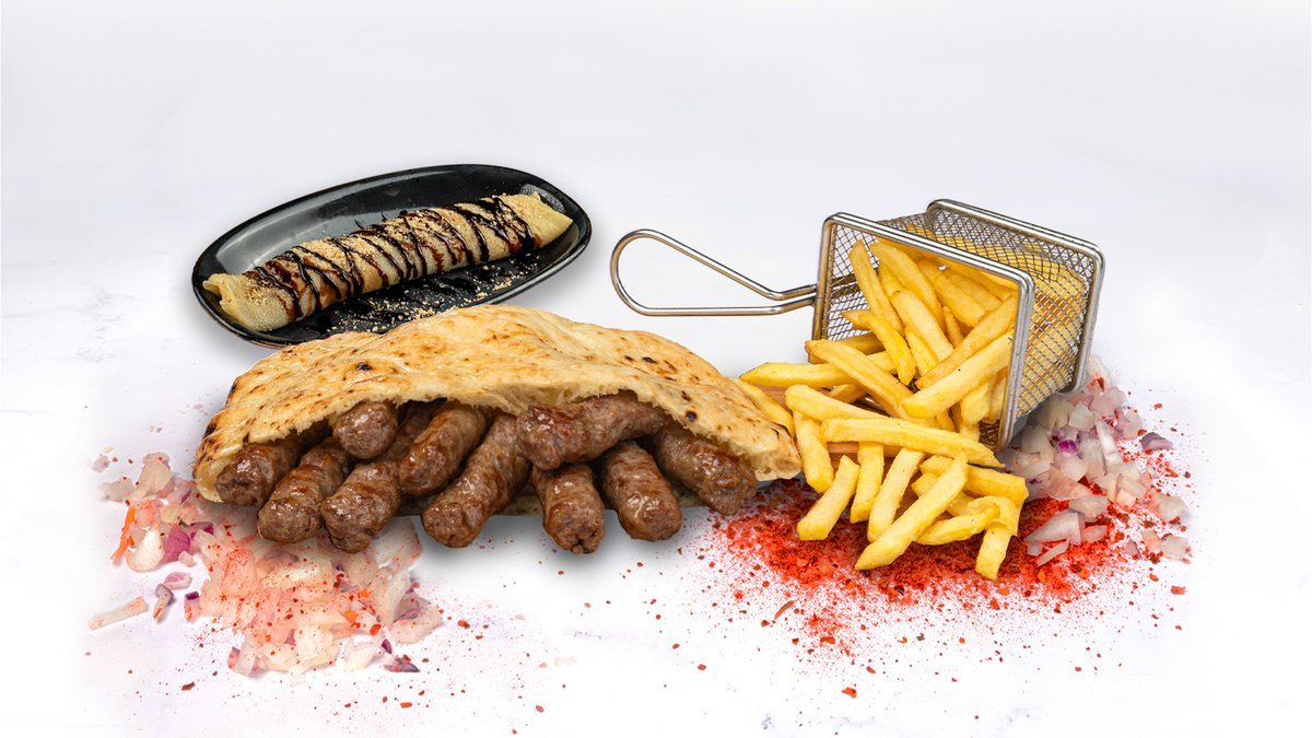 Tradicionalni ćevapi od čistog junećeg mesa 250g, 1/2 somun, pomfrit 200g, 1 palačinka sa kremom i mlevenim keksom