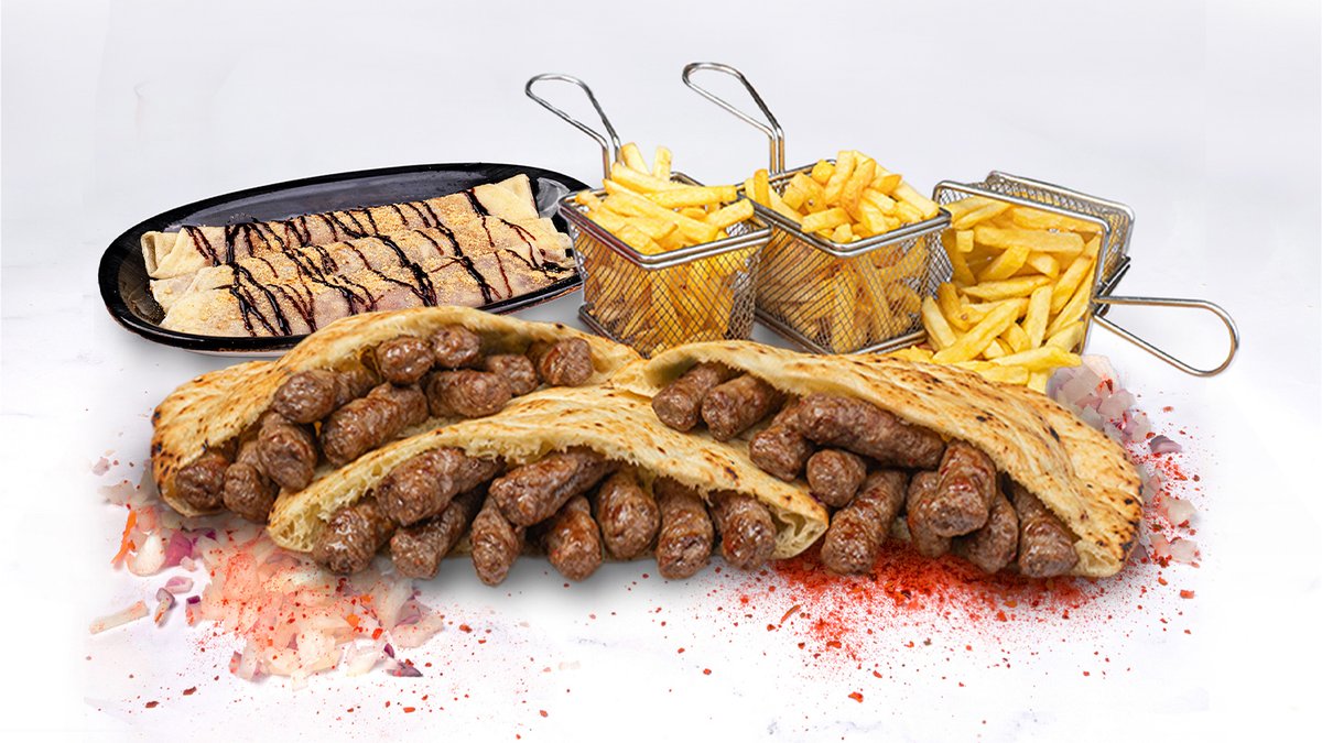 2x Tradicionalni ćevapi od čistog junećeg mesa 250g, somun, pomfrit 200g, palačinke sa kremom i plazmom