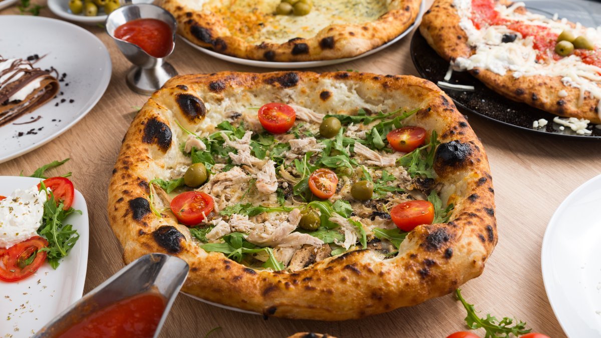 pavlaka, pileće belo meso, kačkavalj, origano, pečurke, masline, rukola, cherry paradajz