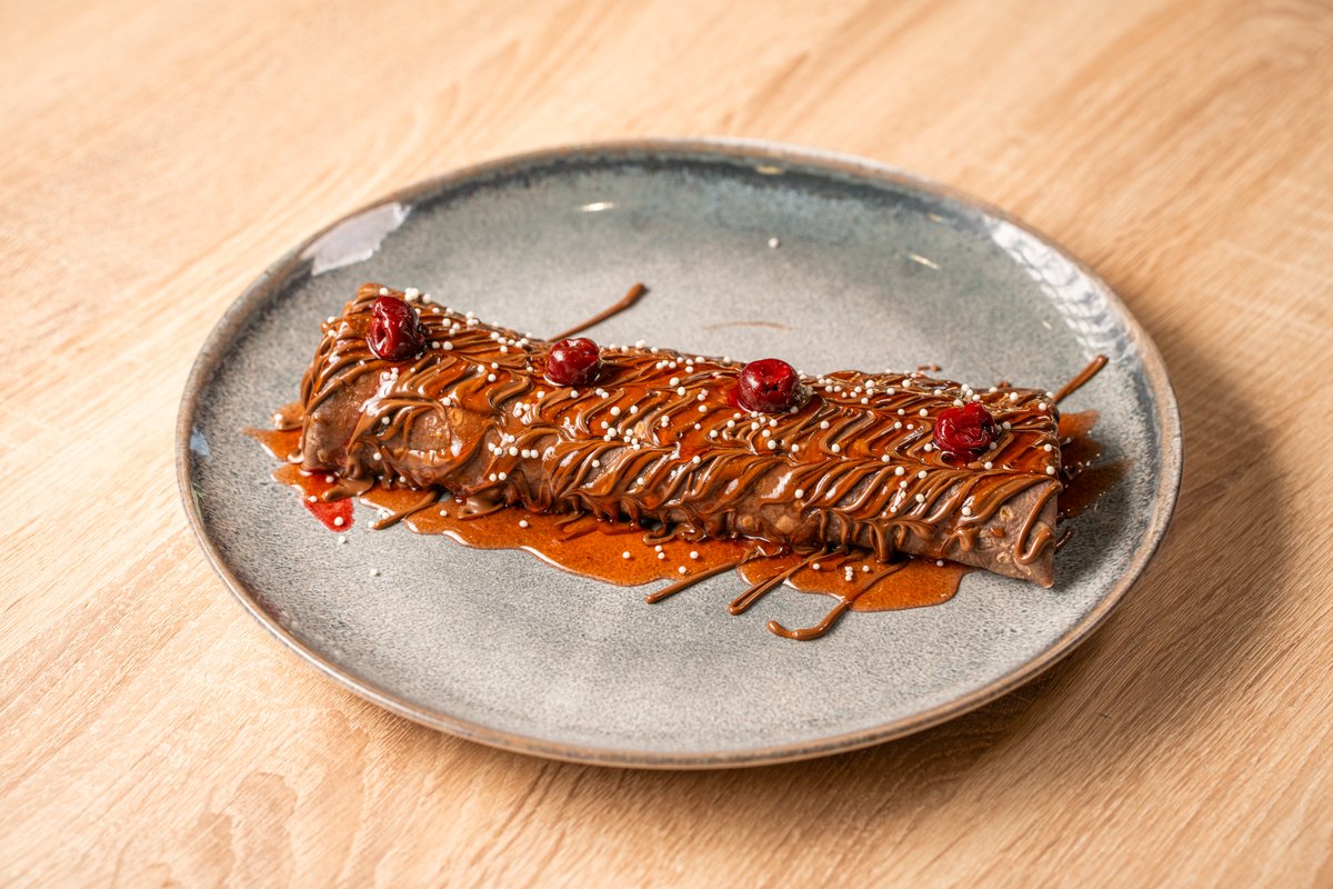 čoko palačinka, nutella, višnje, plazma mlevena, komadići bele čokolade
