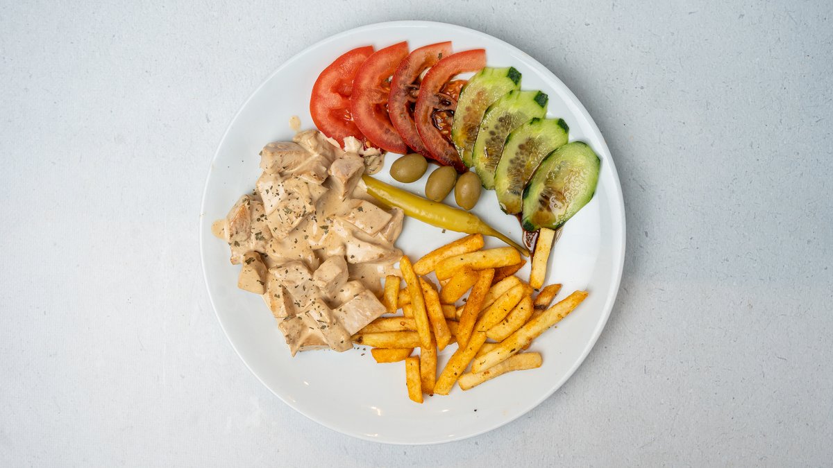 Pulë, pomfrit, ullinj, speca djegës, salcë