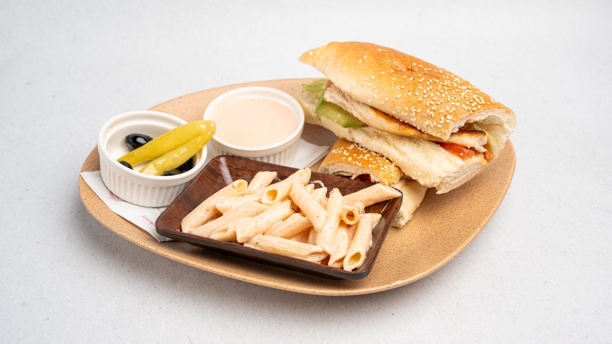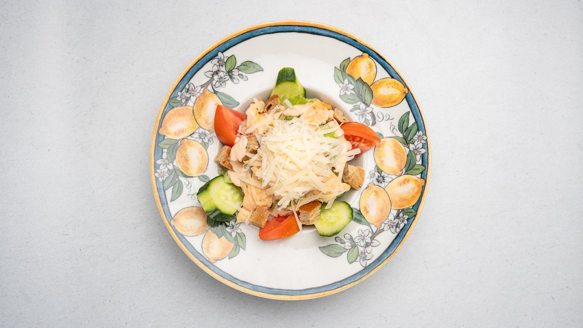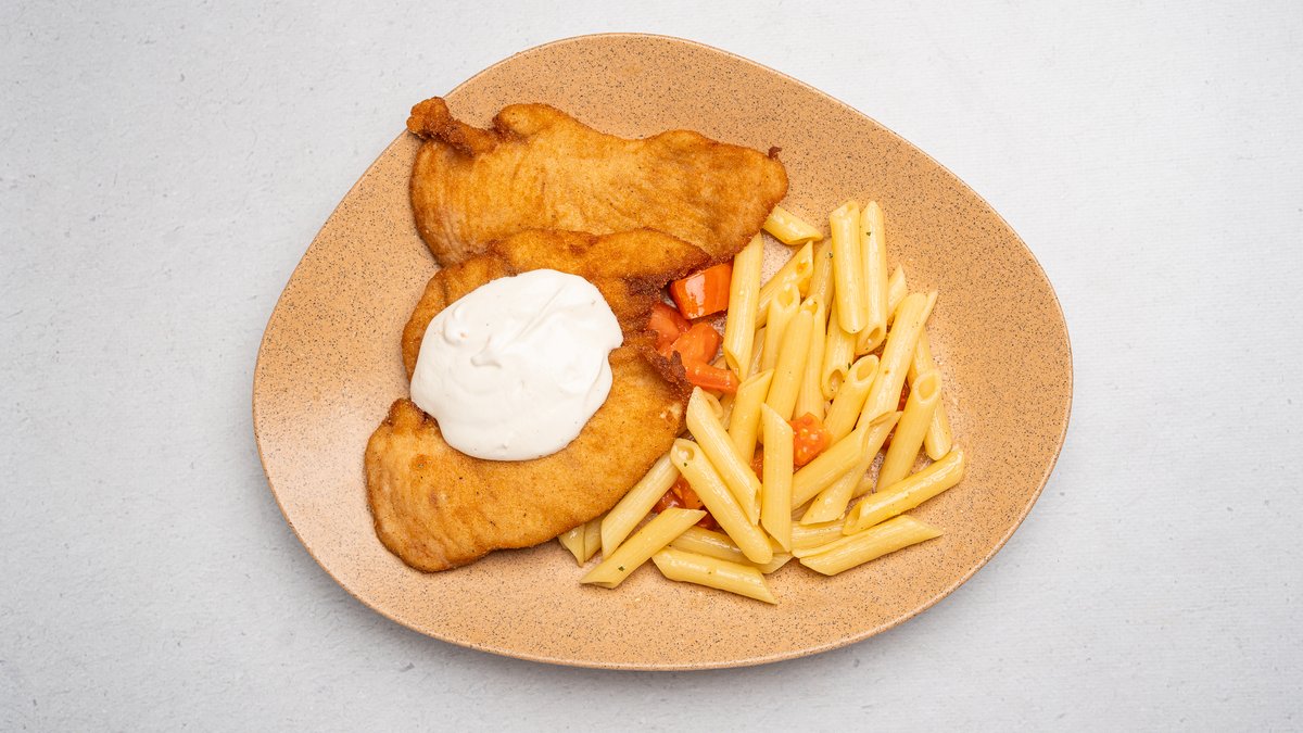 Pulë, domate, tranguj, marule, shërbehet me pasta, sos, fafarona, ullinj