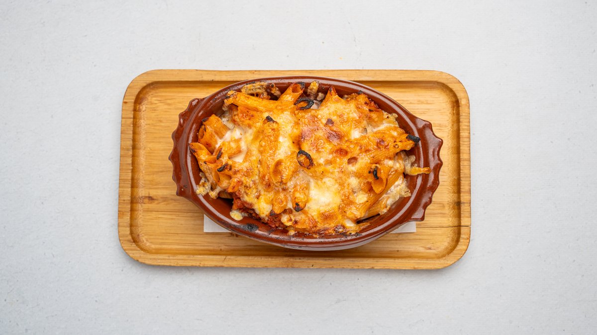 Kaçkavall, mish viçi, shërbehet me patate, ullinj, fafarona, sos