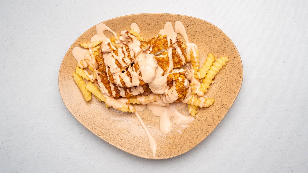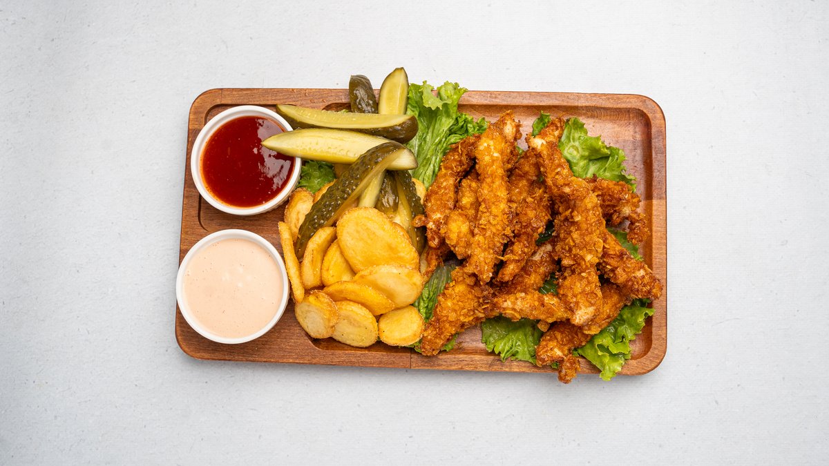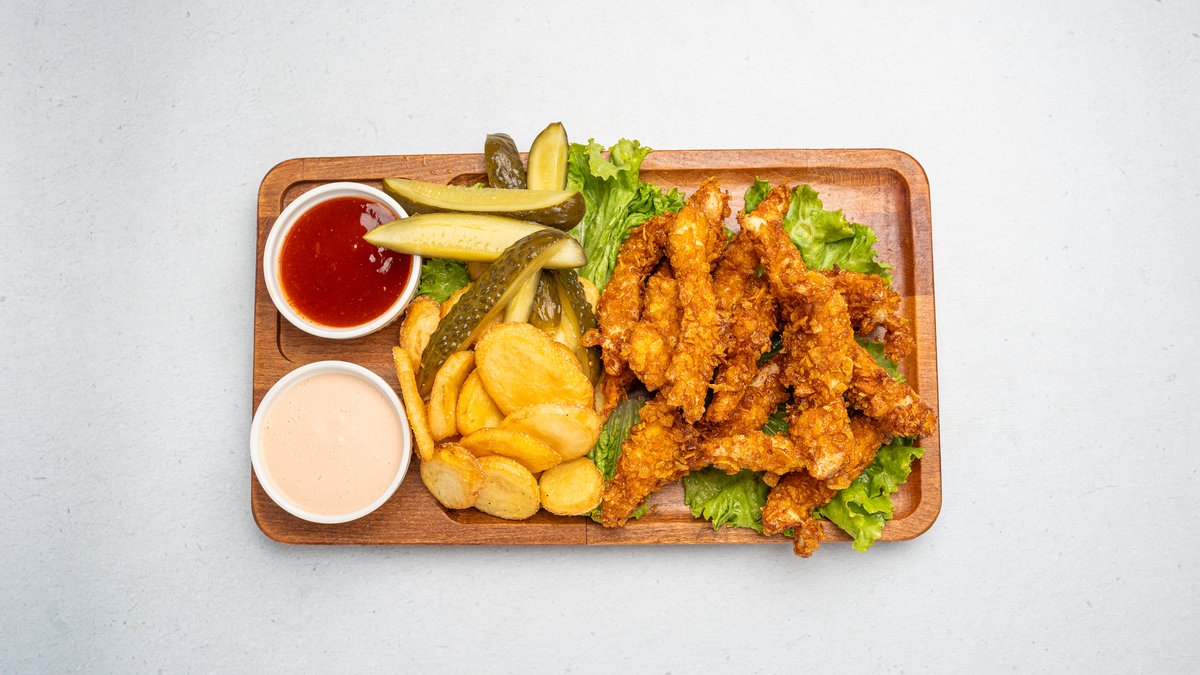 Mish viçi, mish pule, patate, 3 lloje djathërave, fingers ne prezull
