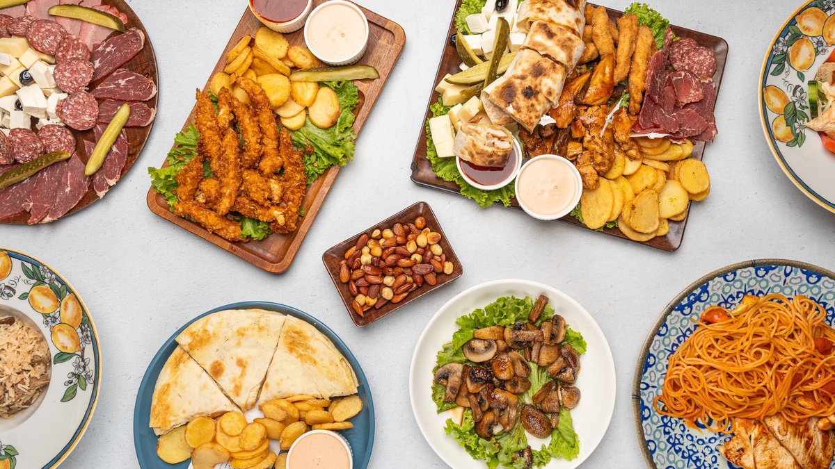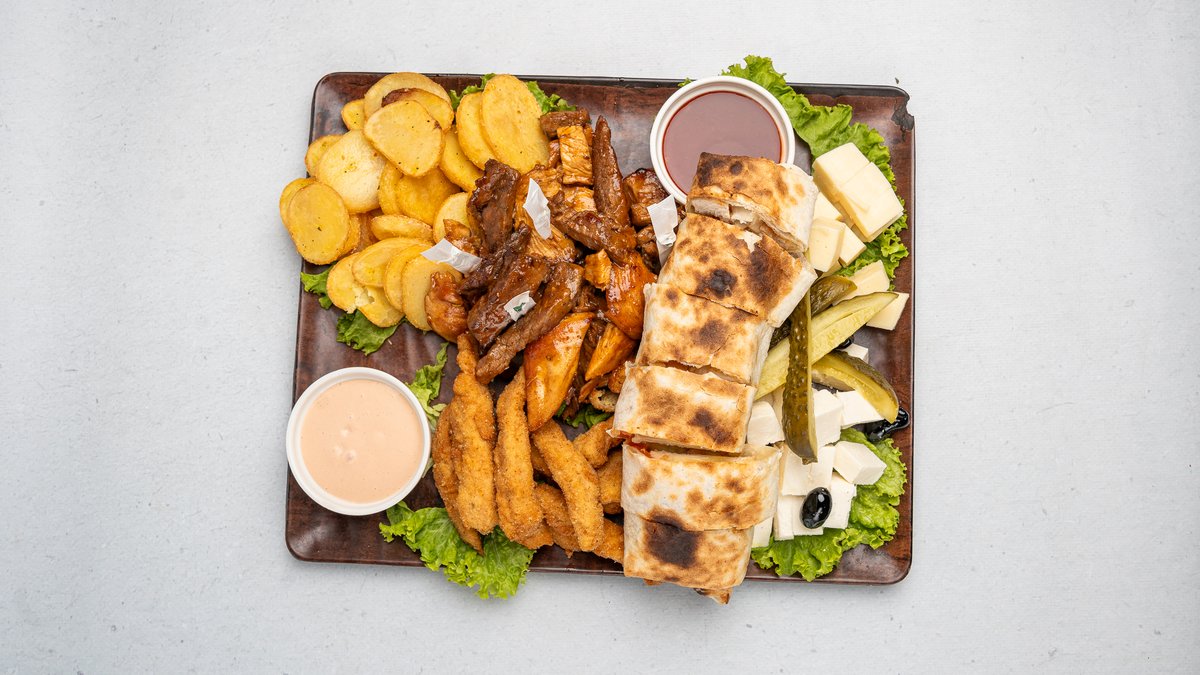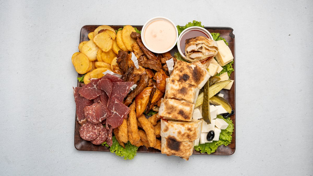 Mish viçi, mish pule, proshutë, suxhuk, patate, 3 lloje të djathërave, fingers ne prezull