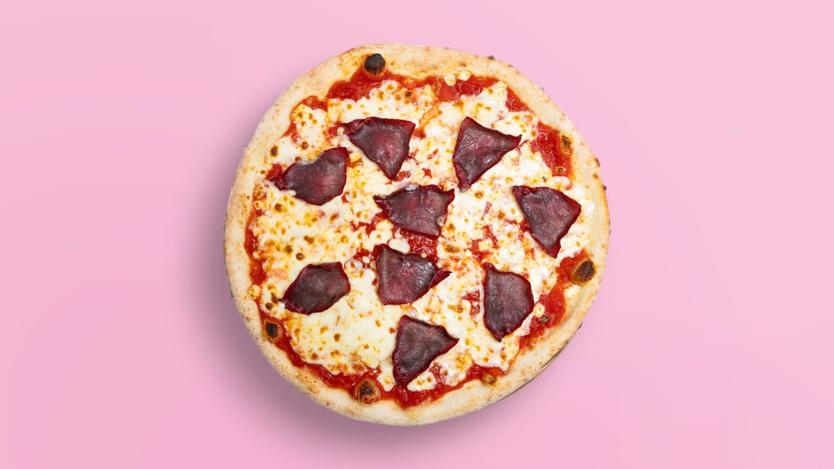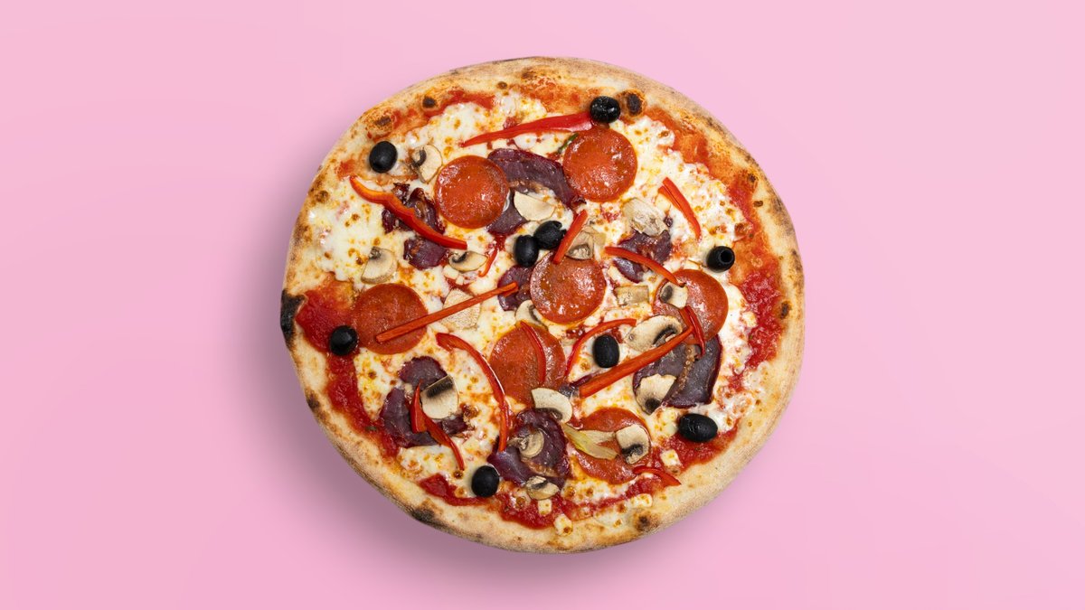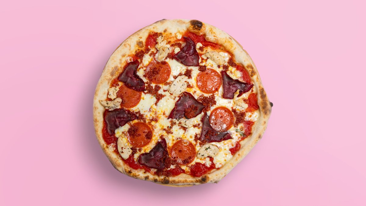 Salcë domatesh, djathë mocarela, proshutë, pepperoni, suxhuk, fileto pule. 32 cm