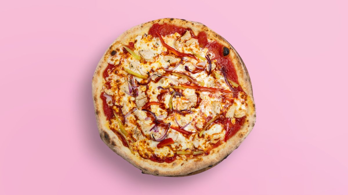 Salcë BBQ, djathë mocarela, fileto pule, speca, qepë e kuqe. 32 cm