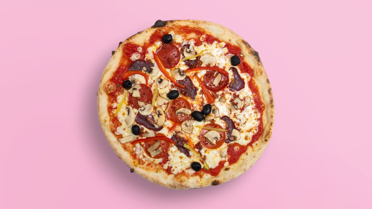 Salcë domatesh, djathë mocarela dhe 4 përbërës sipas zgjedhjes. 32 cm