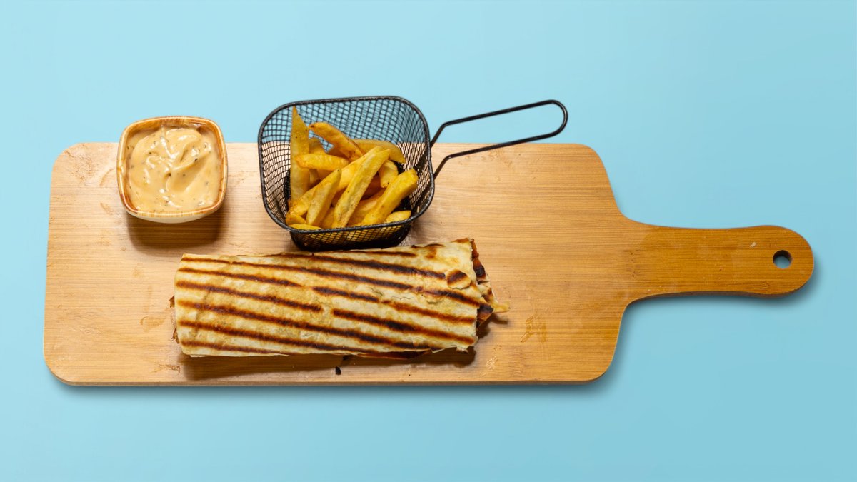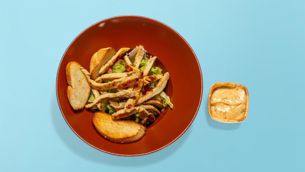Mish pule, sallatë jeshile, domate, tranguj turshi, sos