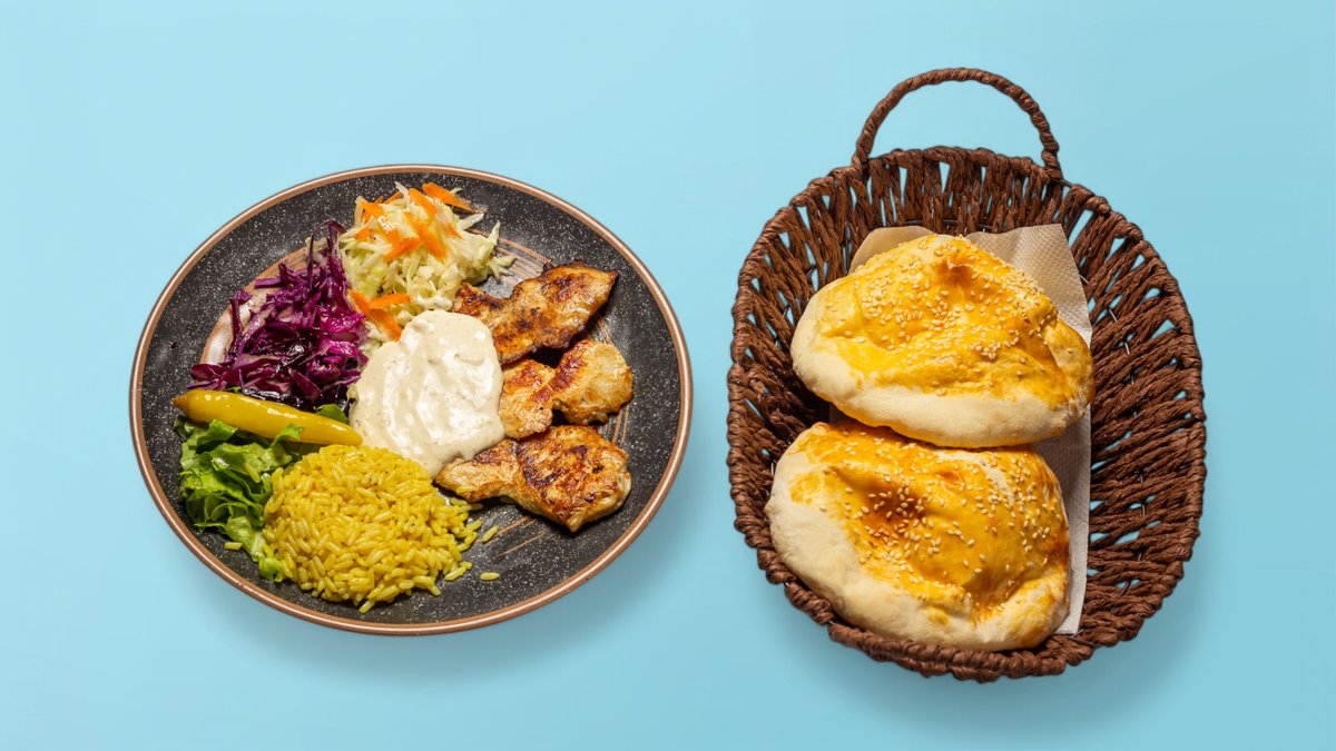 Pleskavicë pule, sallatë, kastravec, sos