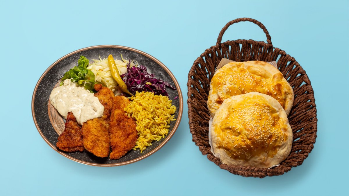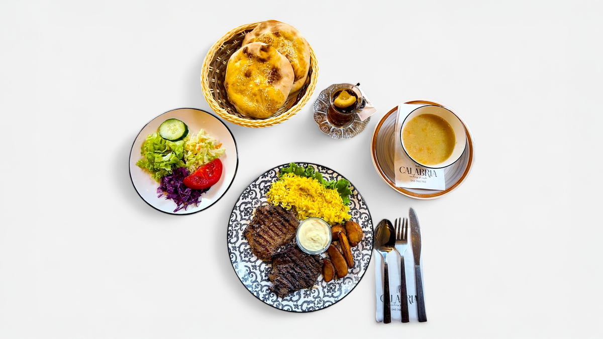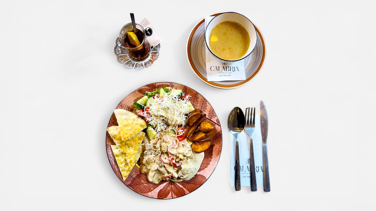 Shnixell i butë viçi, patate, oriz, supë, sallatë të freskët, bukë shtëpie dhe çaj rusi