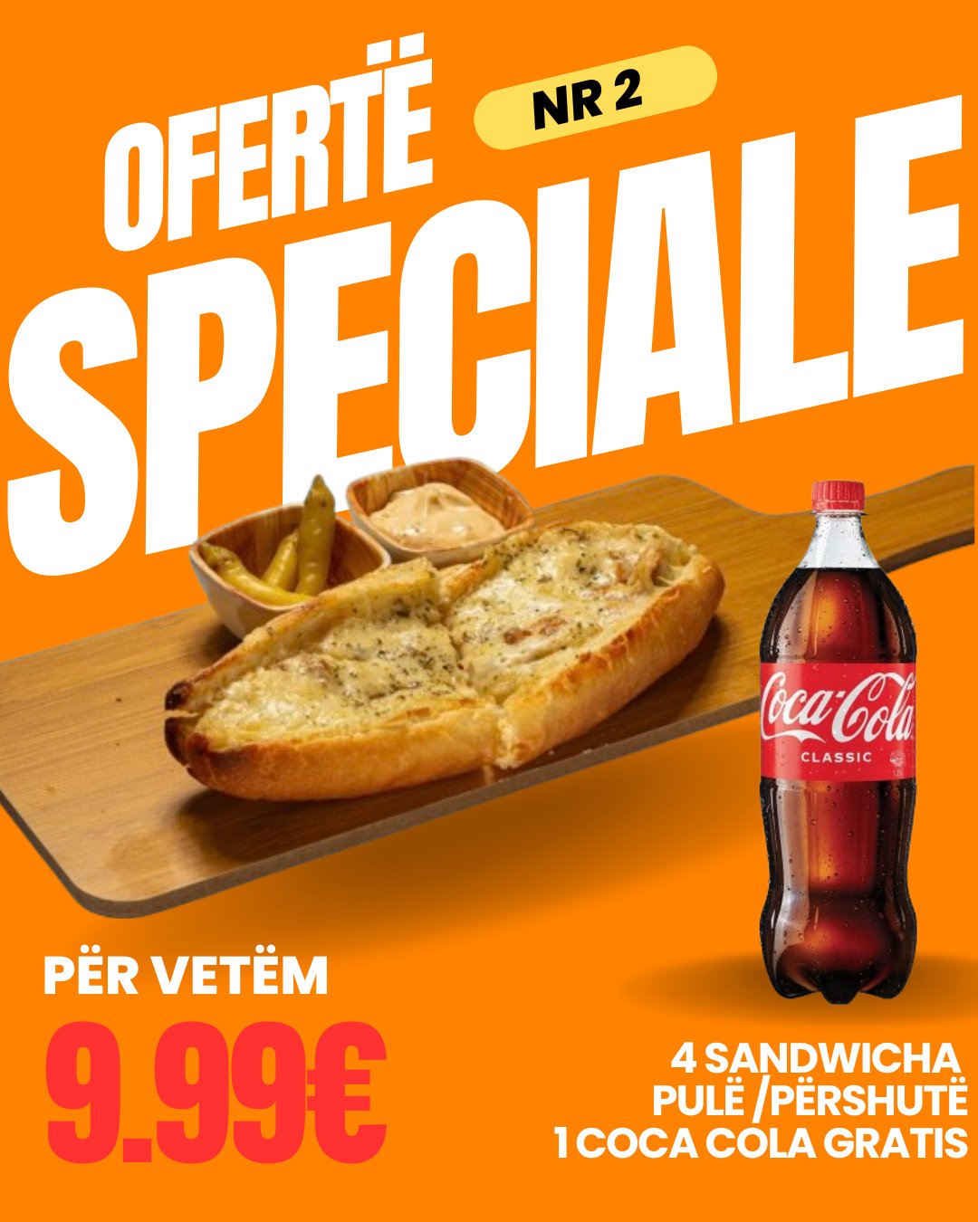4 Sandwicha (pule / përshutë + 1.25L Coca-Cola FALAS