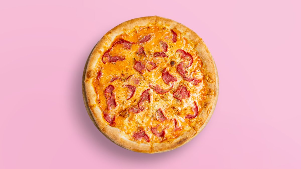Sos domatesh, djathë, pulë, proshutë, suxhuk, këpurdha, origano