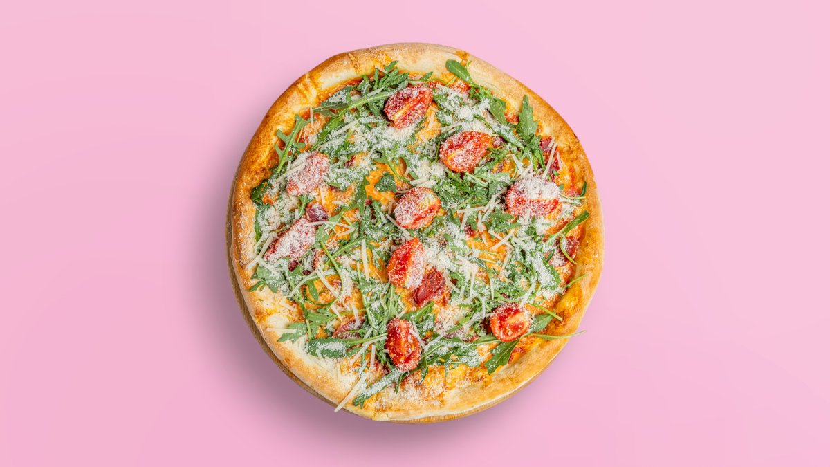 Sos domatesh, djathë, proshutë e tymosur, rukola, domatini, parmezan, origano