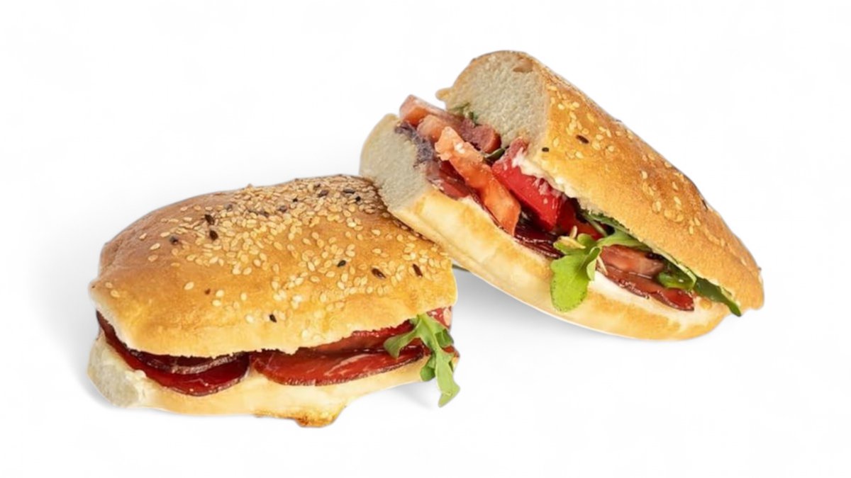 Proshutë, bukë sanduiçi e shtëpisë, salcë speciale shtëpie, domate, rukola, speca të kuq