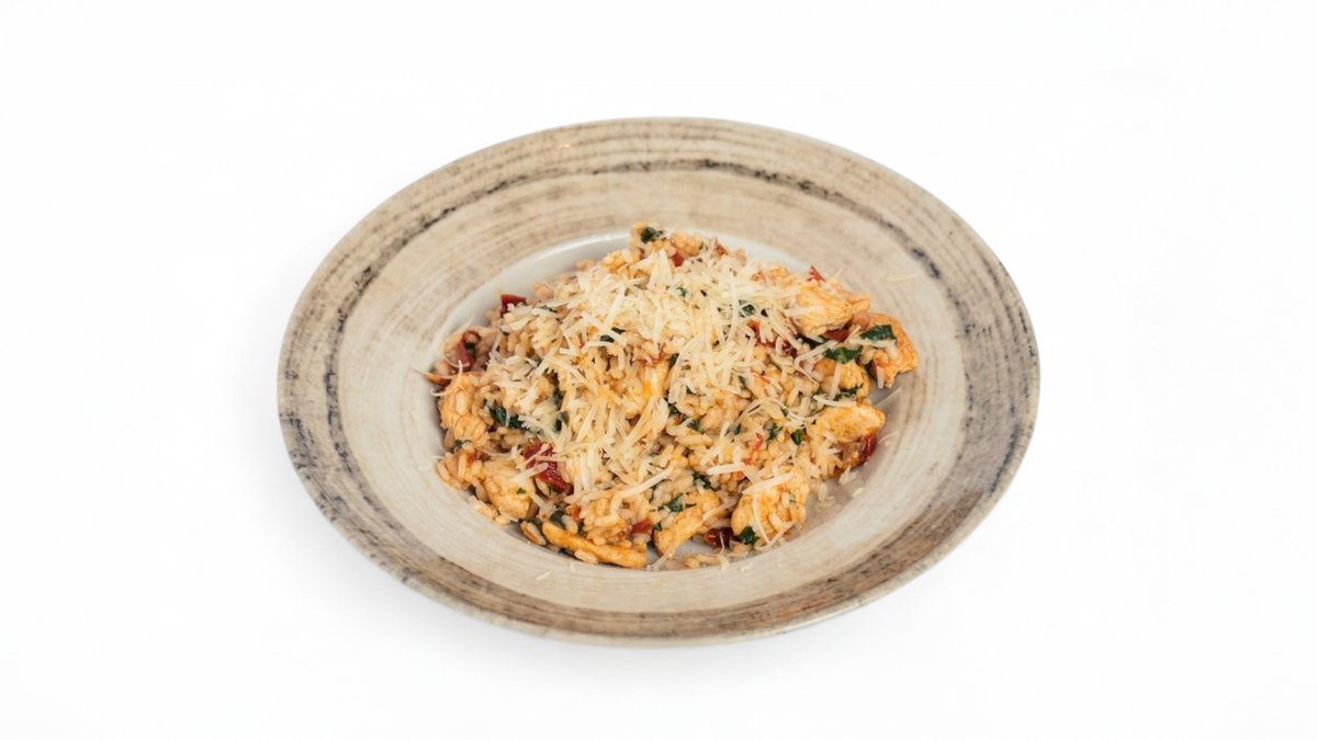Risotto me pulë, spinaq dhe domate të thara