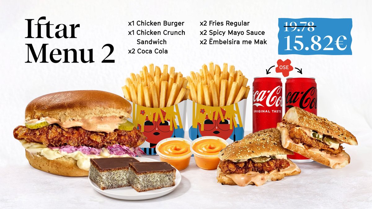 1x Chicken Burger, 1x Chicken Crunch Sandwich, 2x Fries Regular, 2x Coca Cola, 2x Spicy Mayo, 2x Ëmblëlsirë me mak