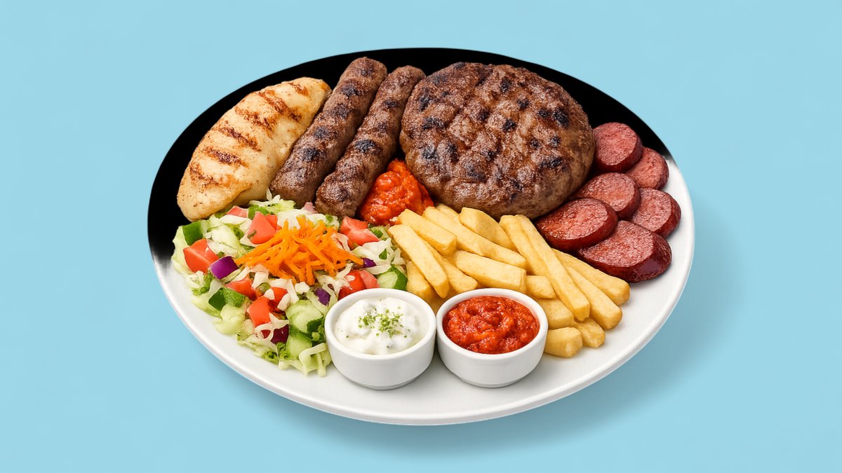 Mish i bardhë, qofte, pleskavicë, shnicëll pule, sallatë, pomfrit, sos