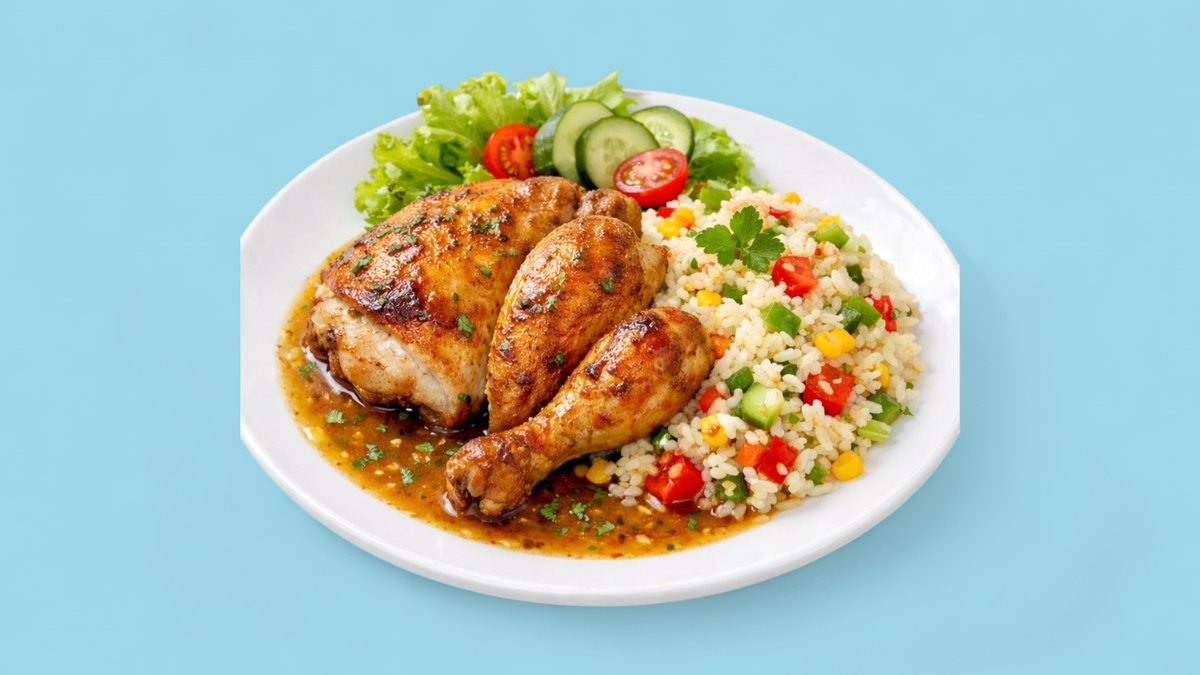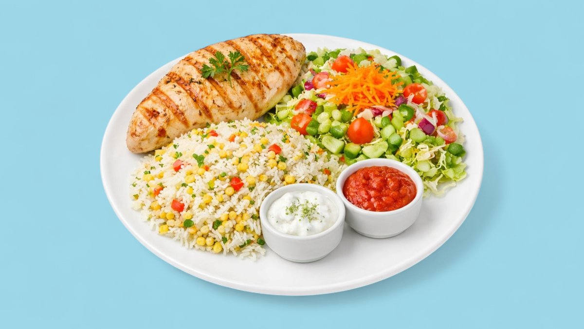 Hurma, supa, sallatë, file pule ose shnicell pule, oriz, sos, pije e gazuar