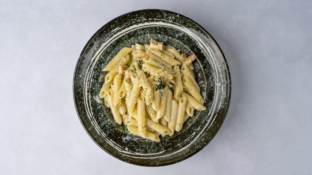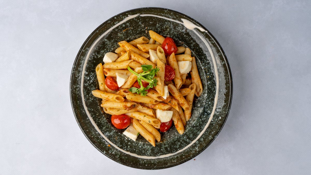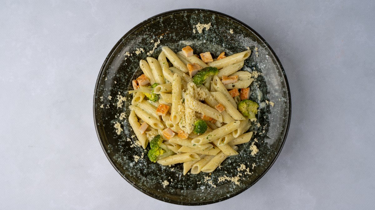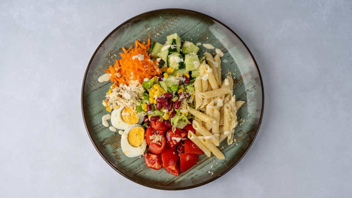Sallatë mix, pulë mix, penne të nxehta, vezë e zier