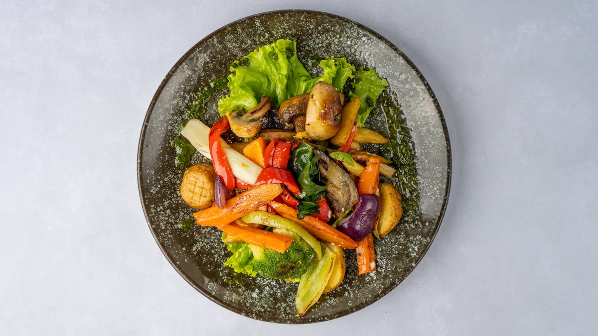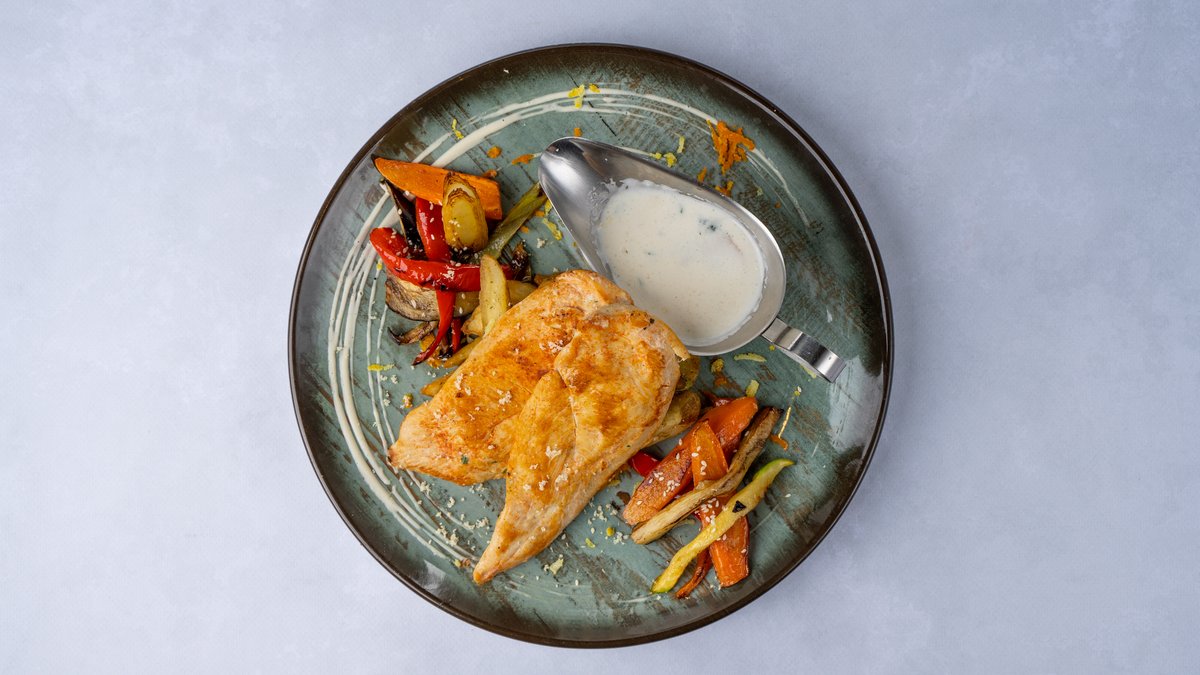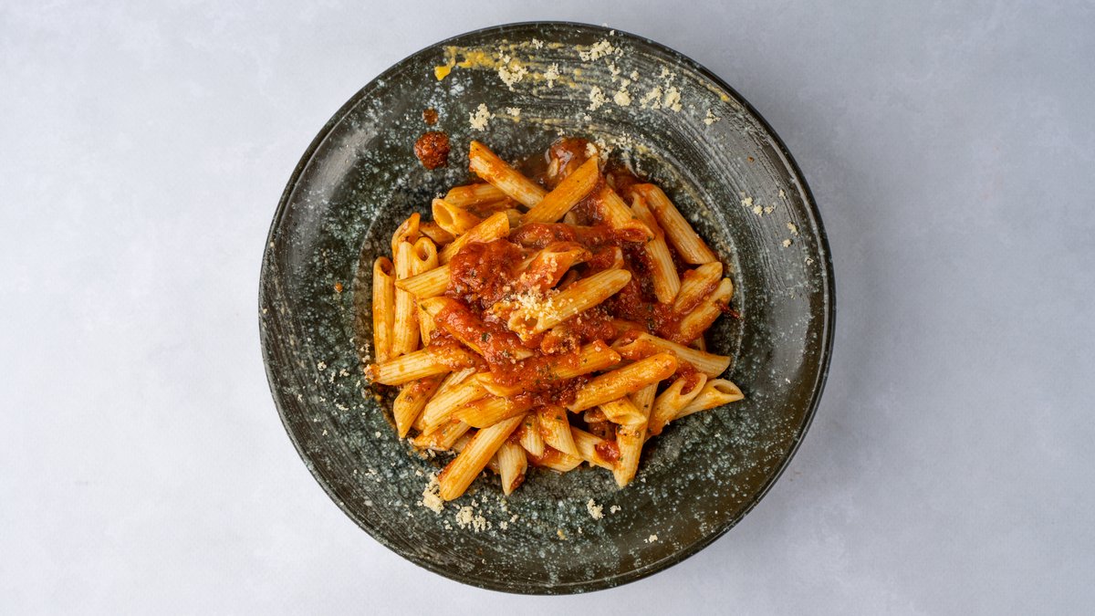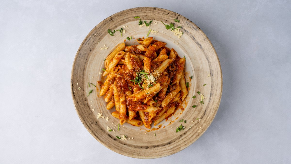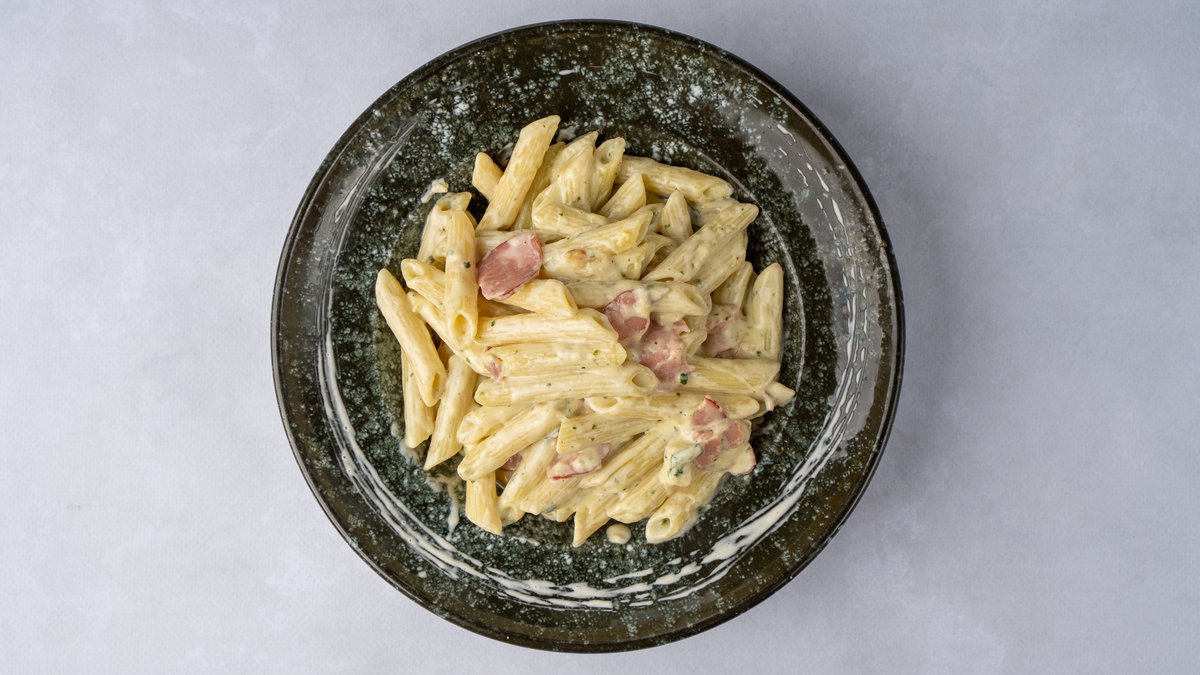 Sallatë mix, pulë mix, penne të nxehta, vezë e zier