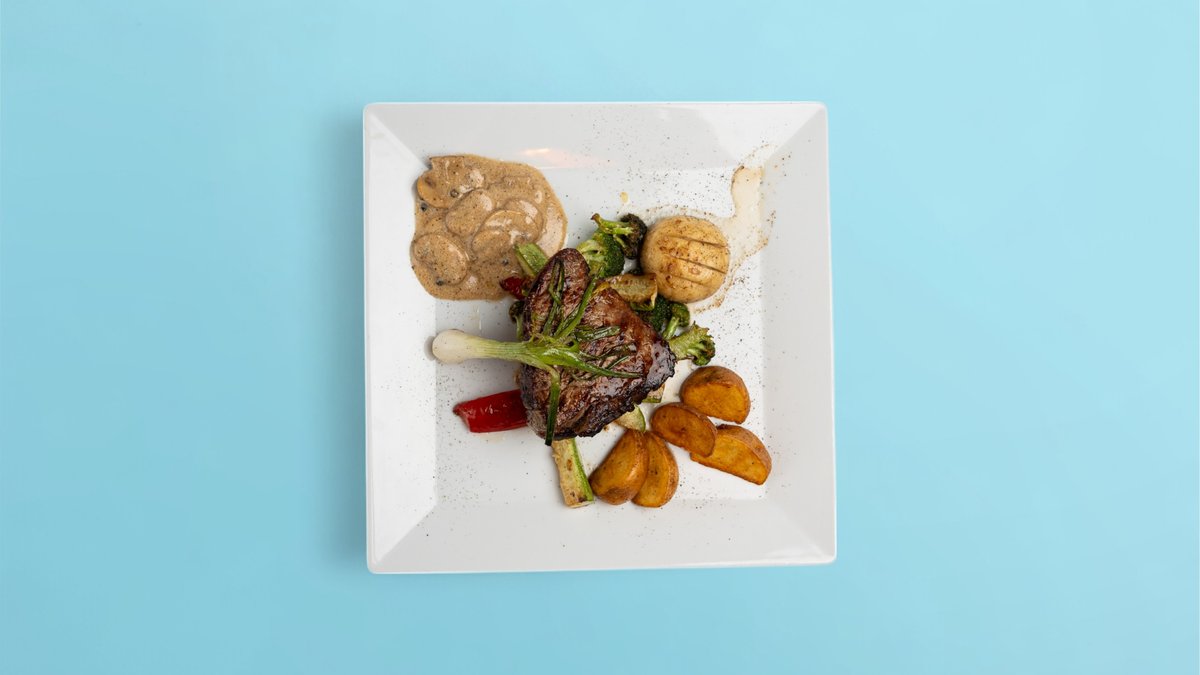 Biftek me Salcë Speciale Shërbyer me Perime & Patate të Pjekur