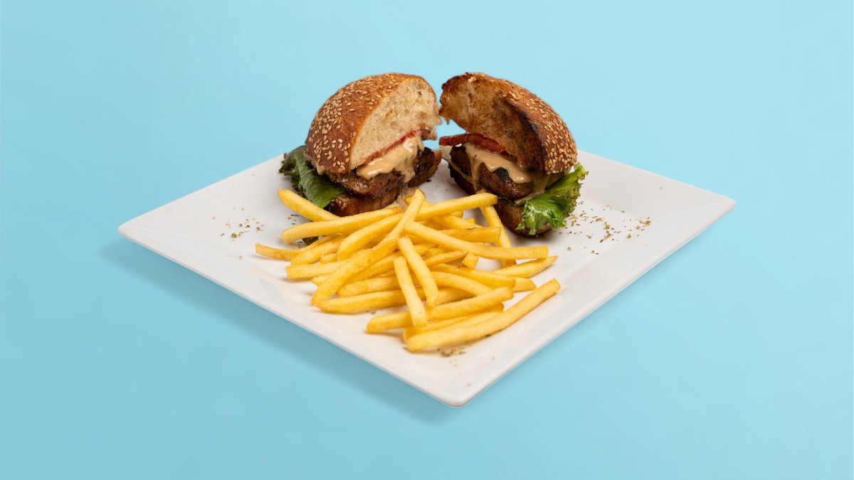 Bukë burgeri, pleskavicë shtëpie, proshutë, speca jalapeno, qepë të karamelizuara, domate, sallatë, tranguj turshi, salcë shtepie