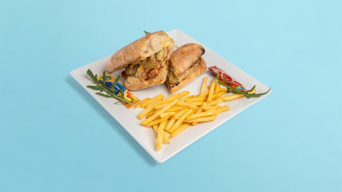 Bukë ciabbata, pulë krokante, misër, tranguj turshi, djathë i shkrirë me salcë shtepie