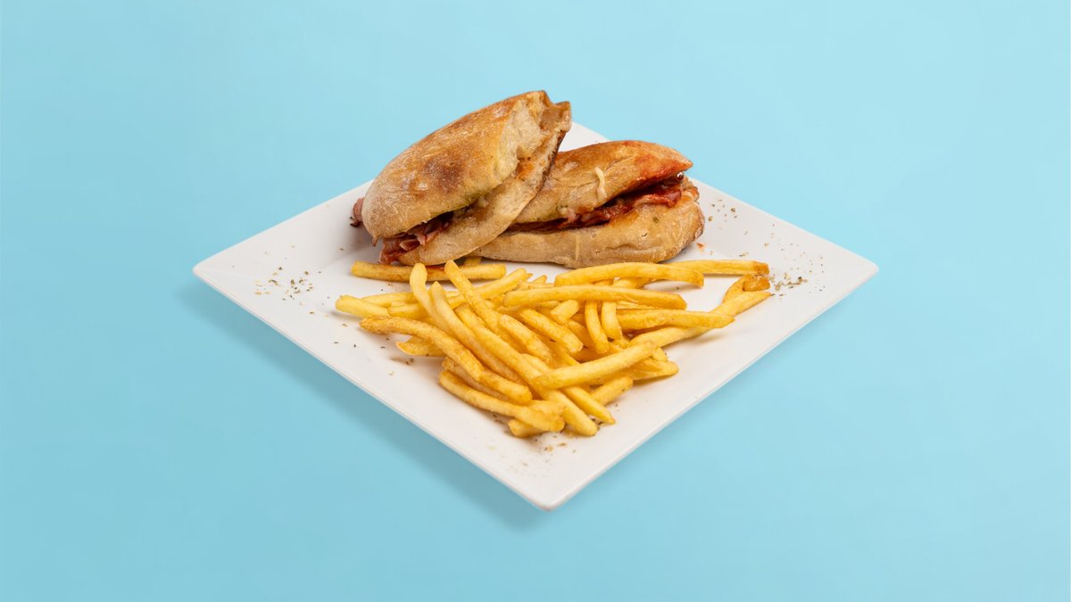 Bukë ciabbata, djathë i shkrirë, proshutë viçi, tranguj turshi me salcë shtepie