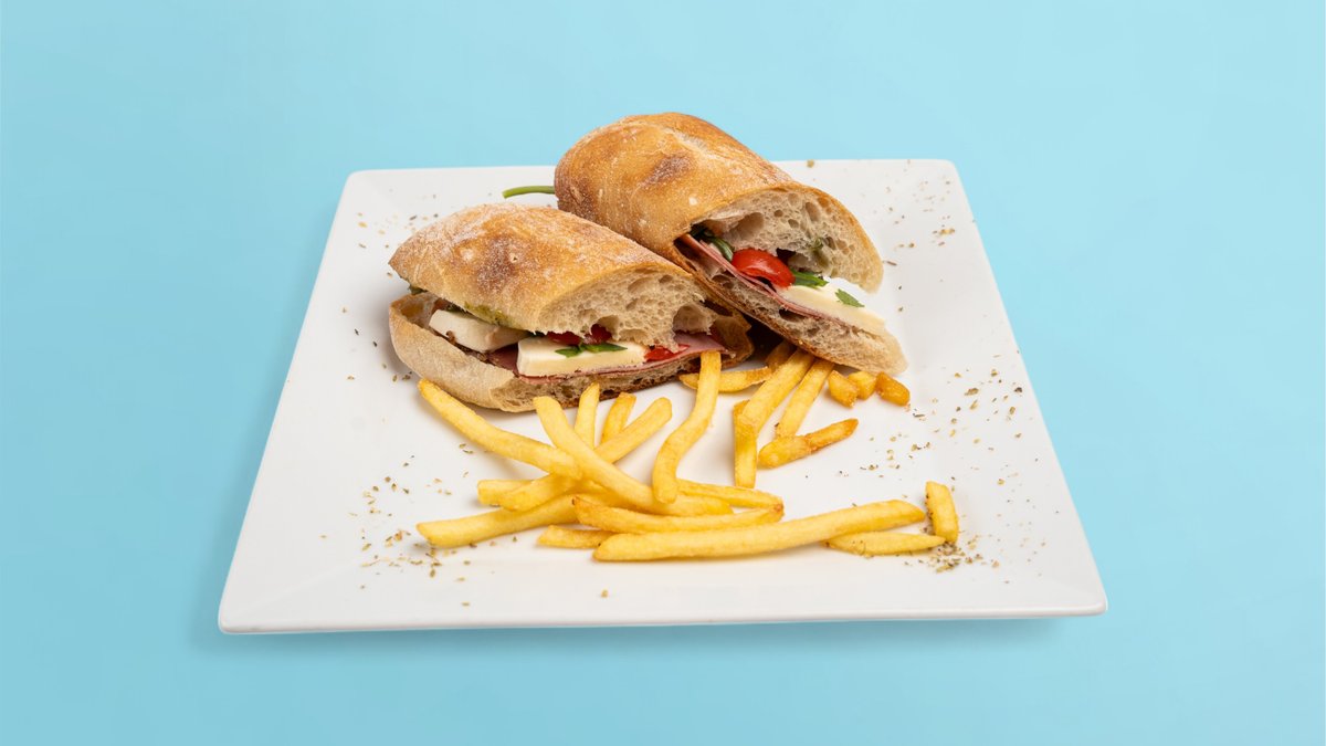 Bukë ciabbata, proshutë viçi, mozzarella, domatini, rukola, pesto