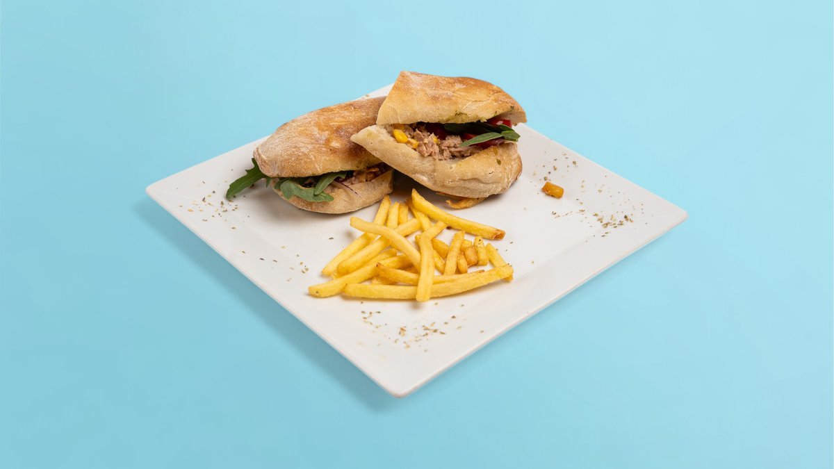 Bukë ciabbata, ton, qepë, misër, domatini, rukola, salcë shtëpie
