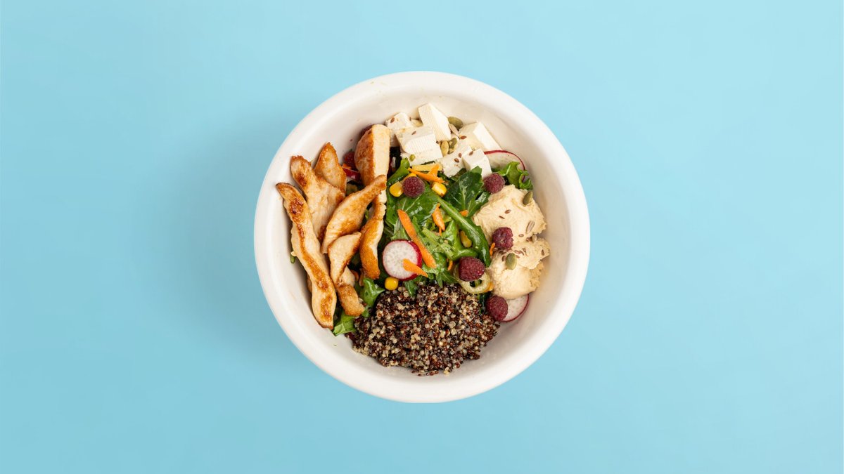 Quinoa tri ngjyrëshe, copëza pule, humus, sallatë, tranguj, domate, djathë i bardhe