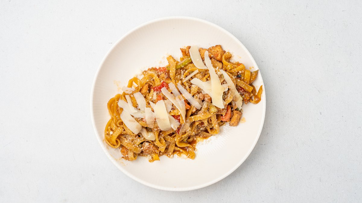 Tagliatelle të përgaditura në stilin Thai me copëza pule, perime të stinës me salcë soje dhe mjaltë, pikante