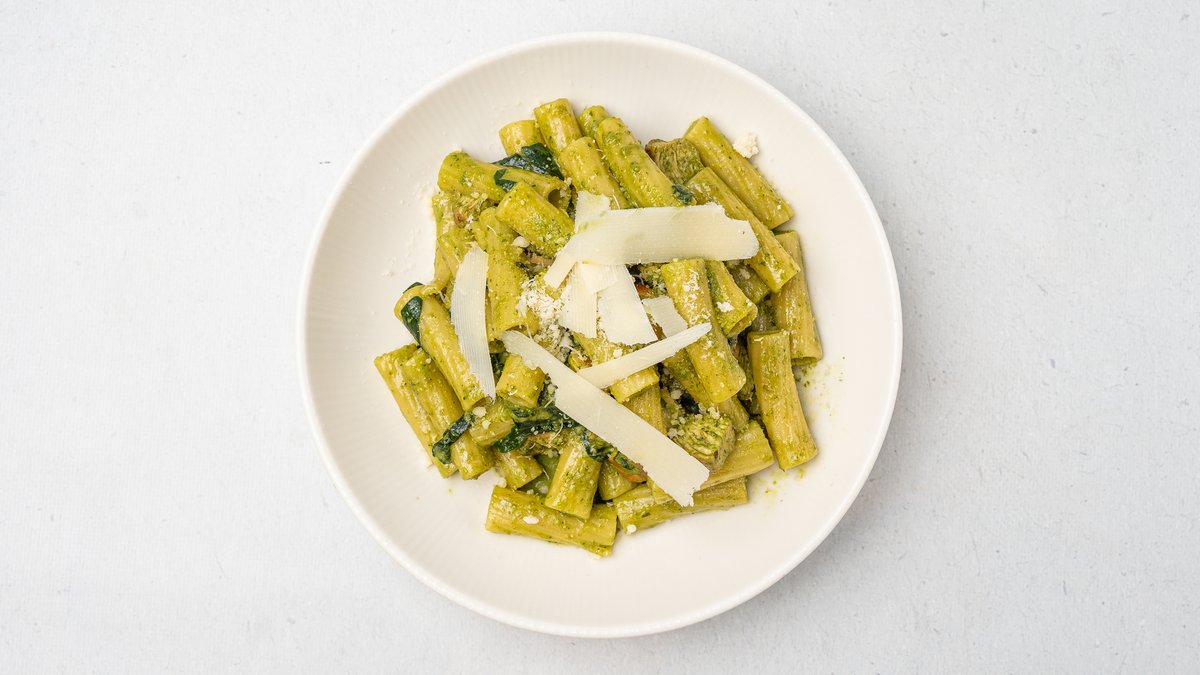 Pene e përgaditur në stilin italian me salcë pesto gjenovese, copëza pule dhe spinaq
