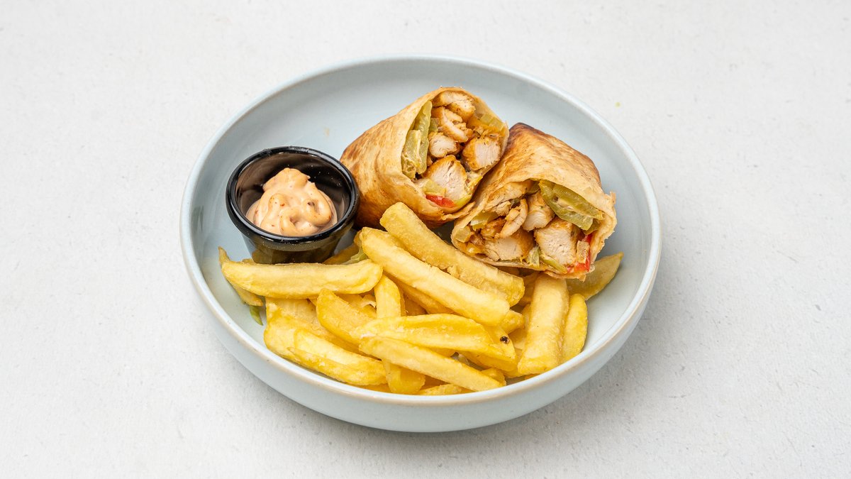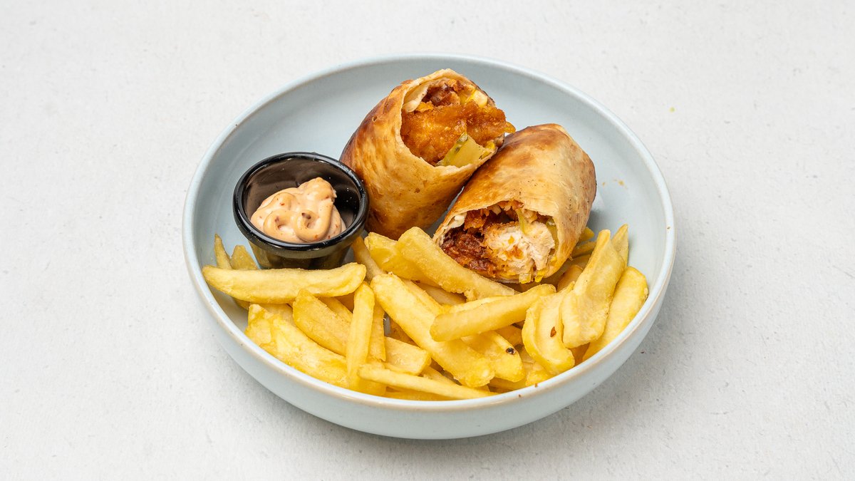 Pulë krokante, majonezë djegëse, misër, kastravec turshi, spec, mbështjellur në petë shoqëruar me patate të skuqura