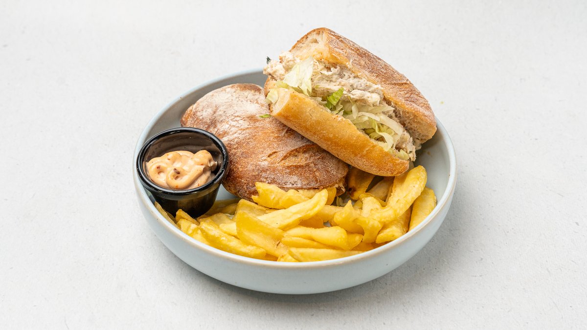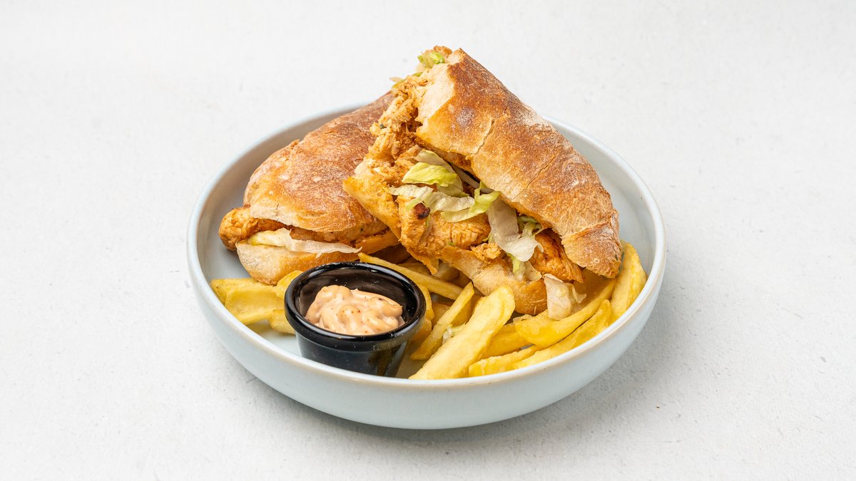 Bukë çiabata e lyer me majonezë djegese, misër, spec, pule krokante, shërbehet me patate të skuqura