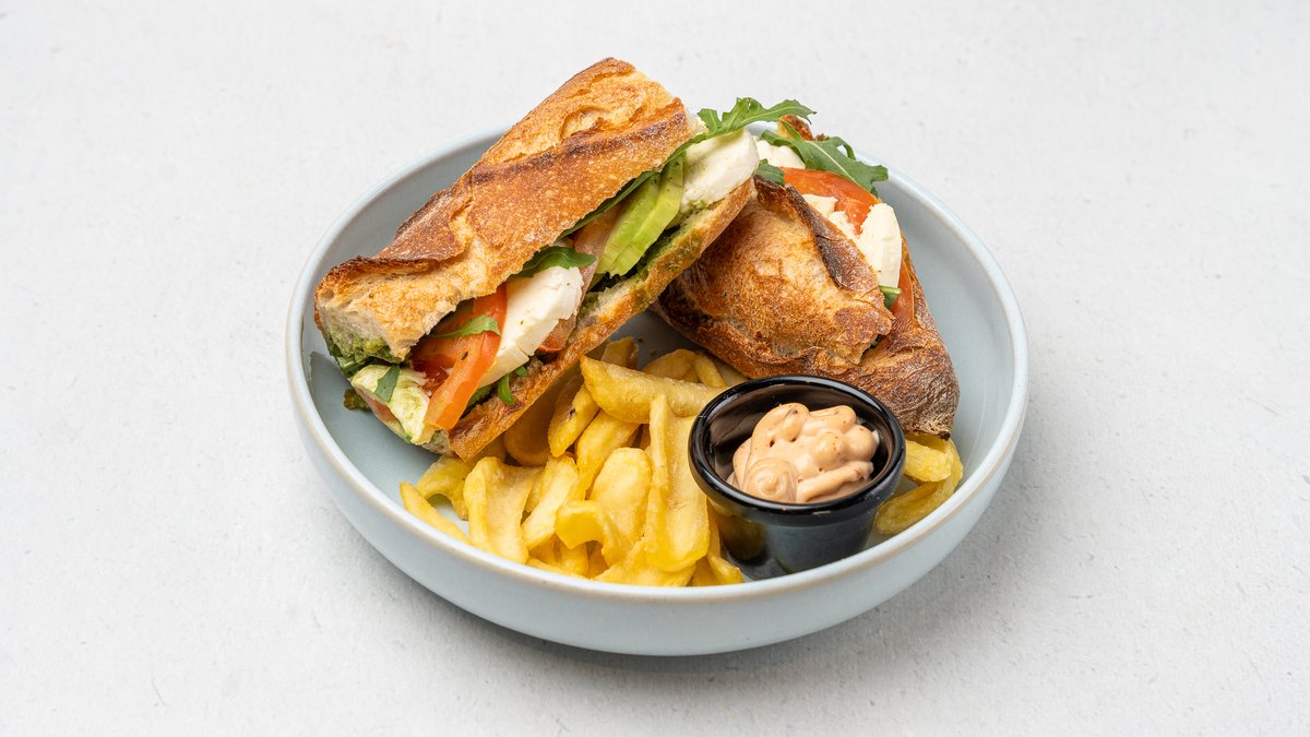 Bagetë, avokado, pesto gjenovese, djathë mozzarella, domate dhe rukola, shërbehet me patate të skuqura