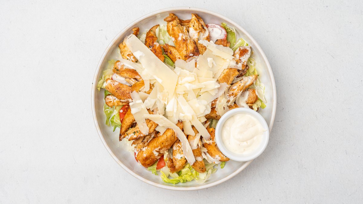 Copëza pule, sallatë iceberg, krutona, pomodorini, djathë parmixhano dhe salcë Çezar