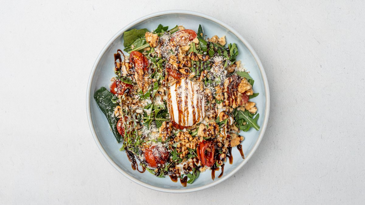 Spinaq , pomodorini, rukola, arra të karamelizuara, djathë, kos grek