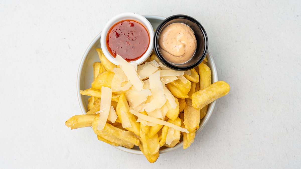 Patate të skuqura të përgaditura në vaj tartufi, shoqërohen me salcë