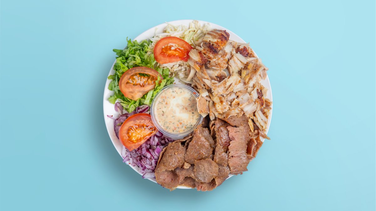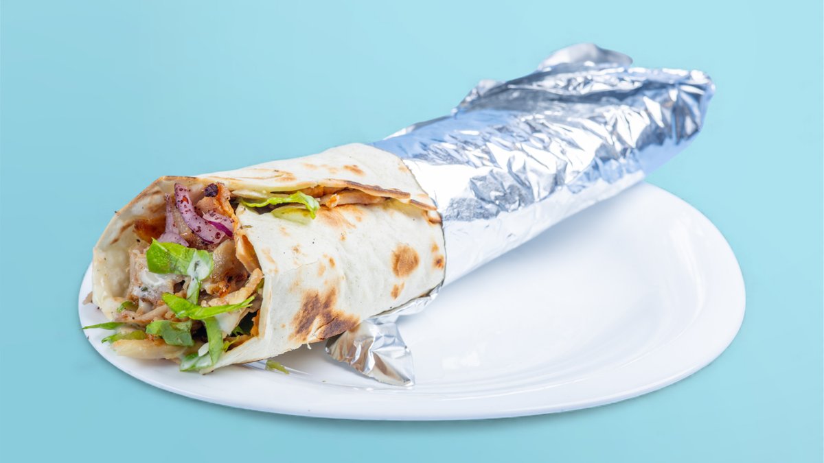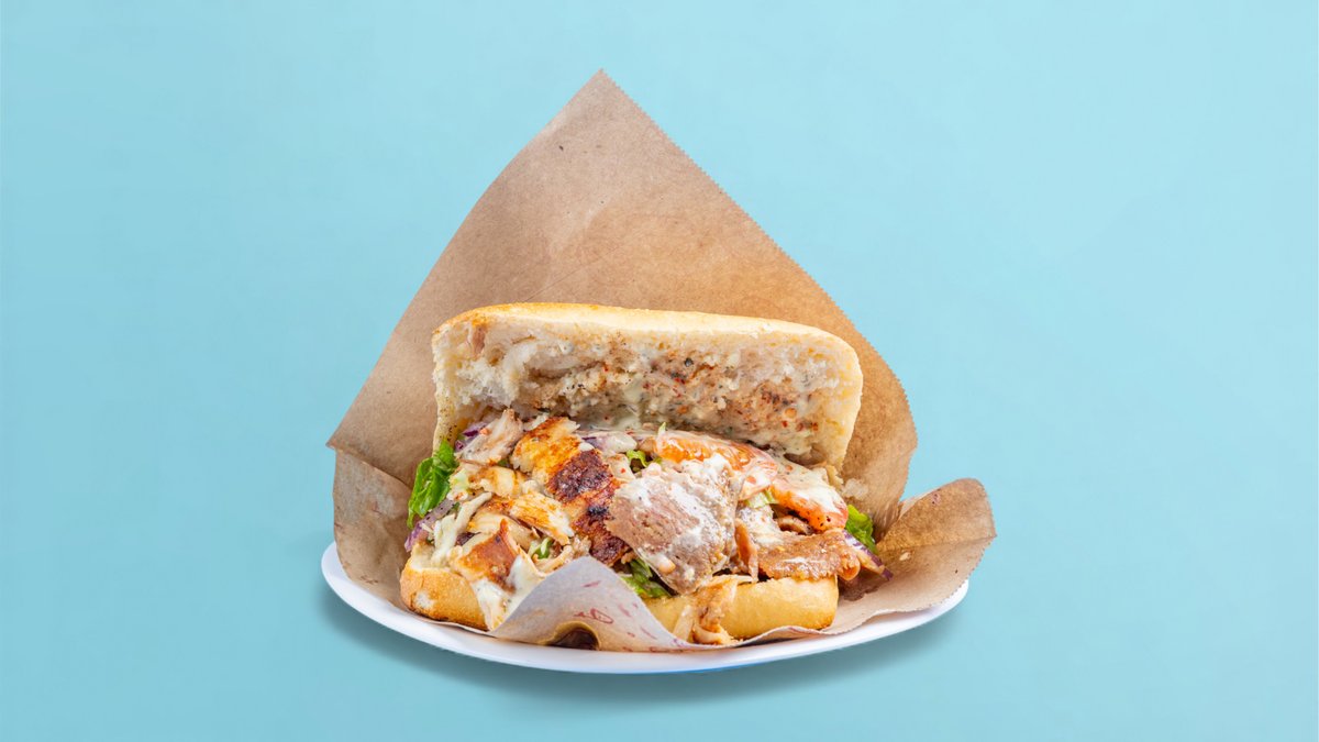 Bukë e mbushur me mish pule, mish viçi, sallatë e gjelbër, lakër, qepë të kuqe, domate, salcë