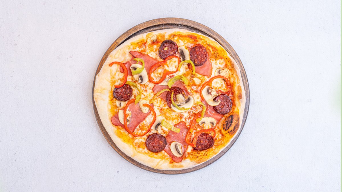 Salcë domatesh, kaçkavall, proshutë suxhuk, kërpudha, speca