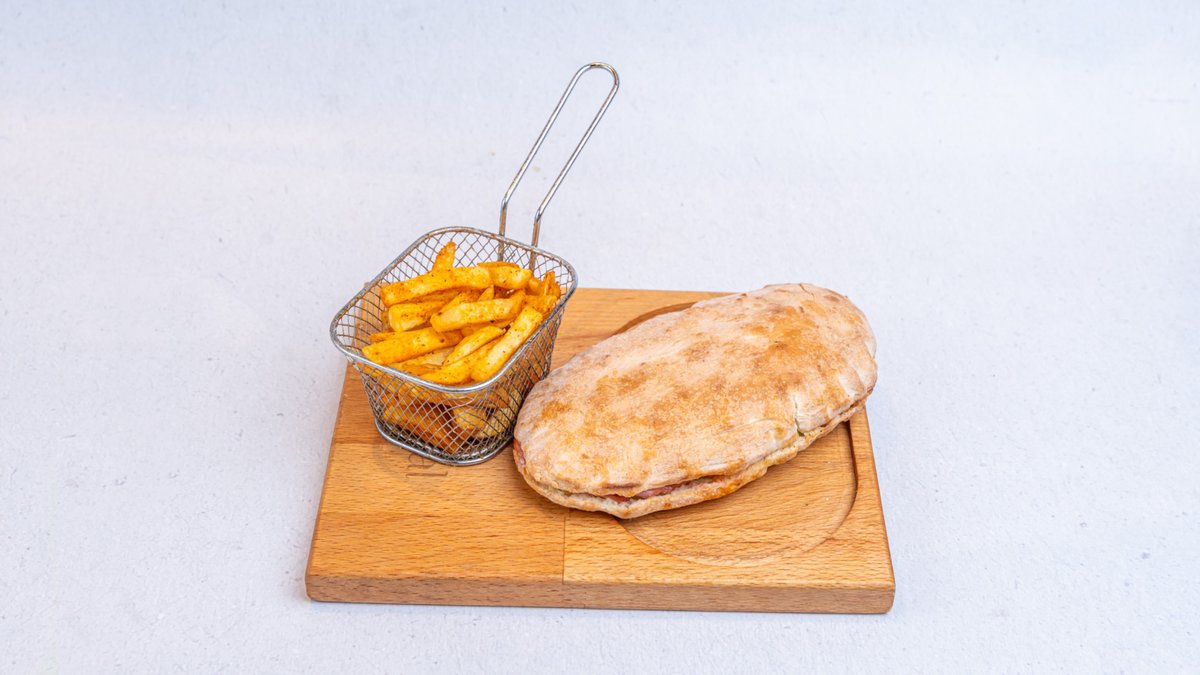 Bukë shtëpie, përshutë, suxhuk & sallatë, servohet me pomfrit & sos