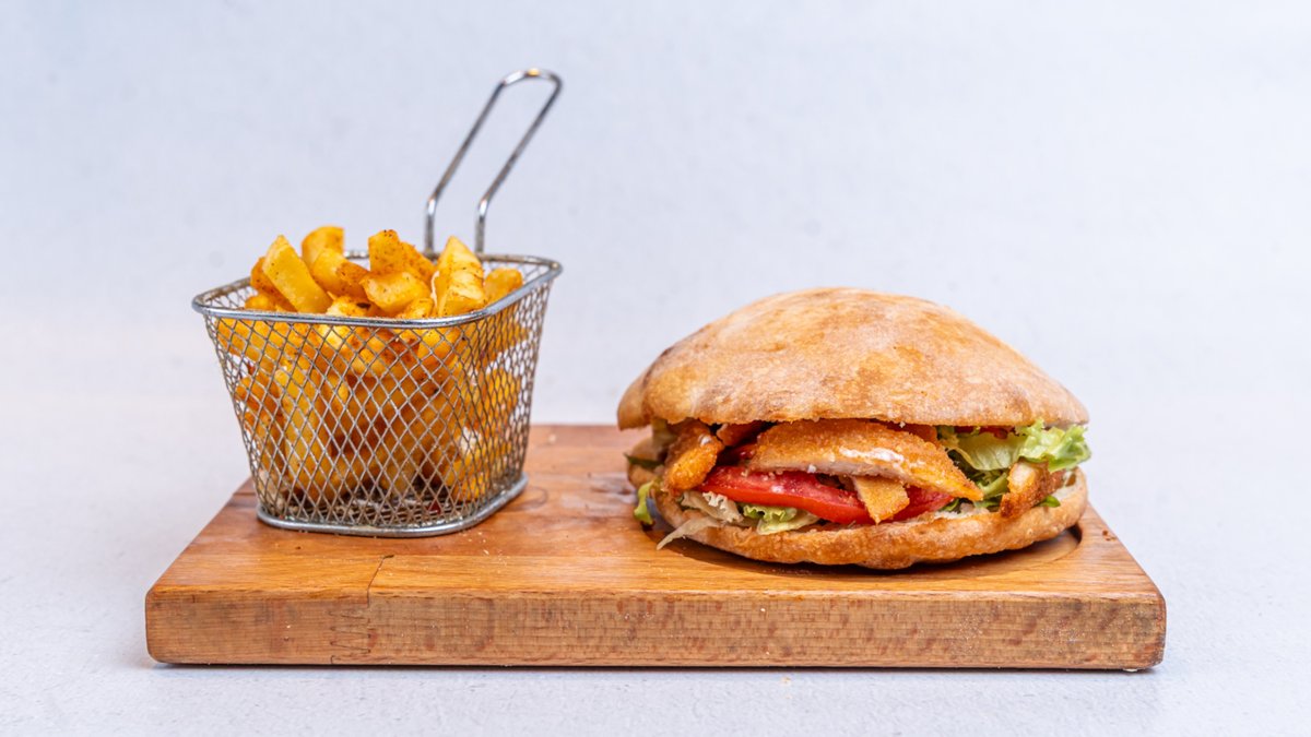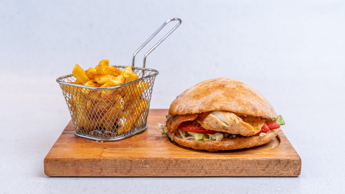 Bukë shtëpie, mish pule & sallatë, servohet me pomfrit & sos