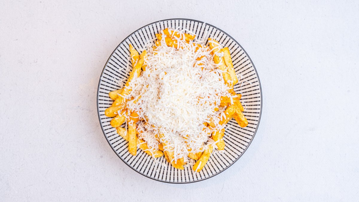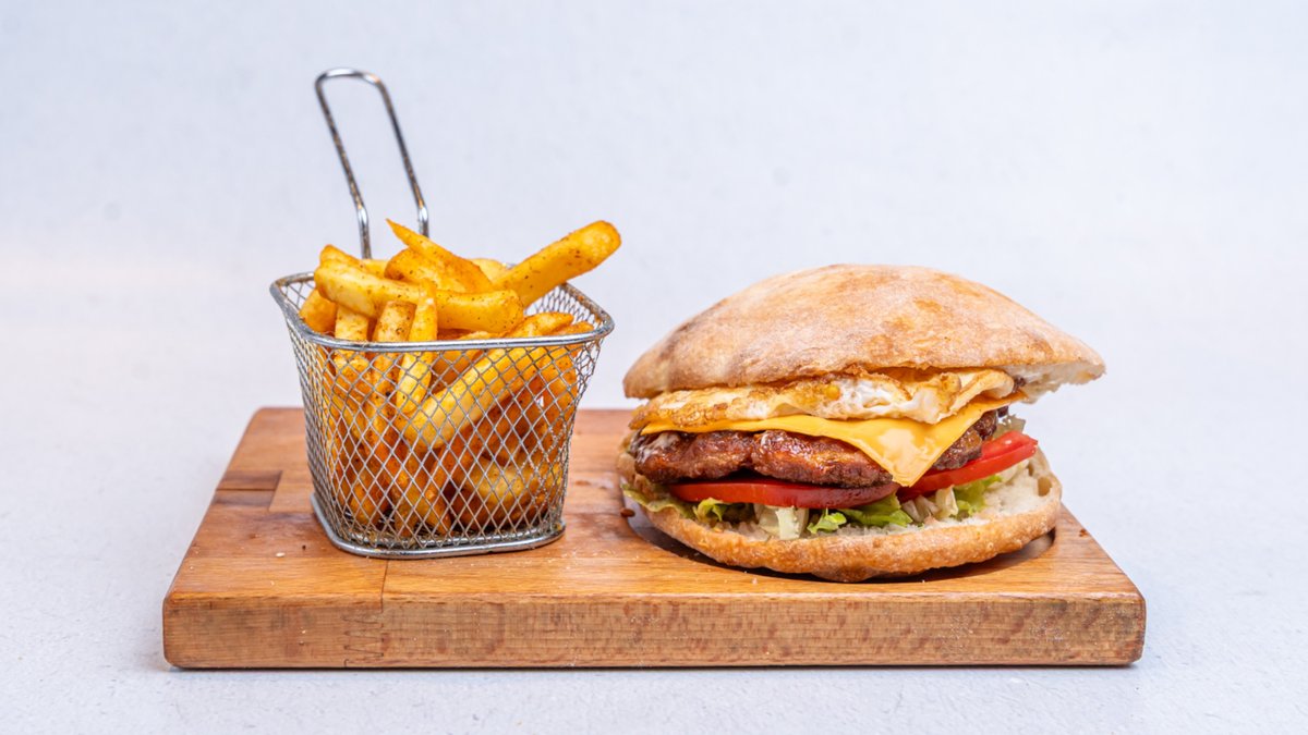 Pleskavice, vezë, djathë, sallatë e gjelbërt domate & servohet me pomfrit & sos